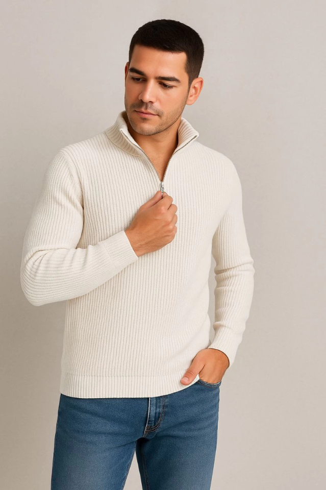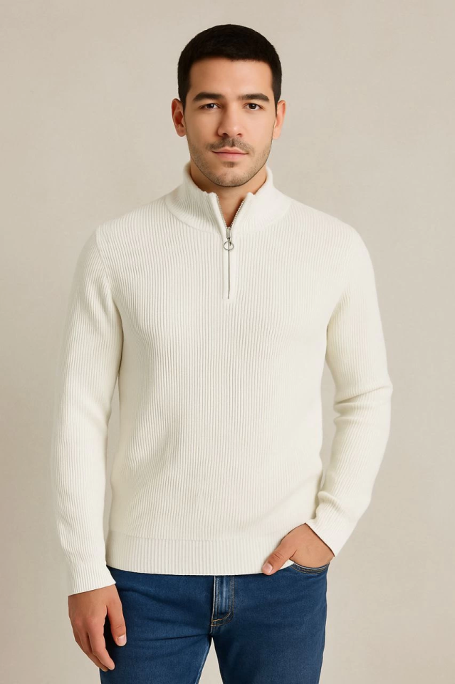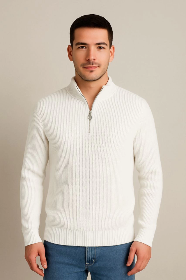 Erkek Yarım Fermuarlı Triko Kazak – Selanik Örgü, Dik Yaka, Pamuklu Dokuma, Regular Fit Uzun Kollu Kışlık Model - Beyaz