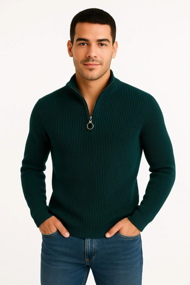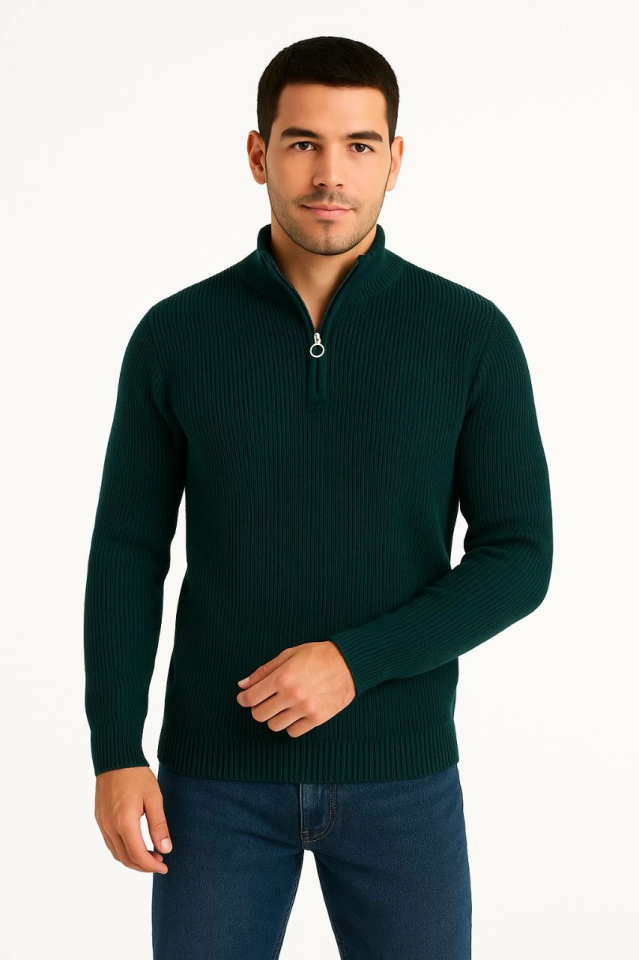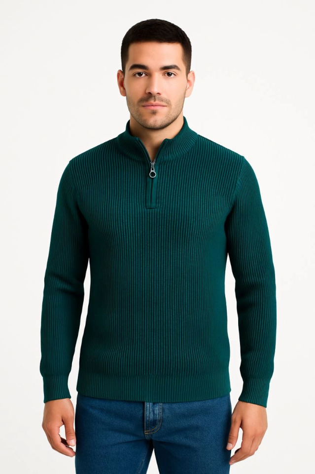 Erkek Yarım Fermuarlı Triko Kazak – Selanik Örgü, Dik Yaka, Pamuklu Dokuma, Regular Fit Uzun Kollu Kışlık...