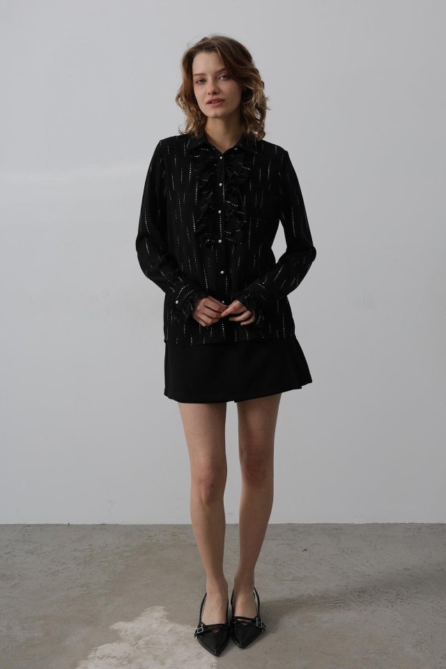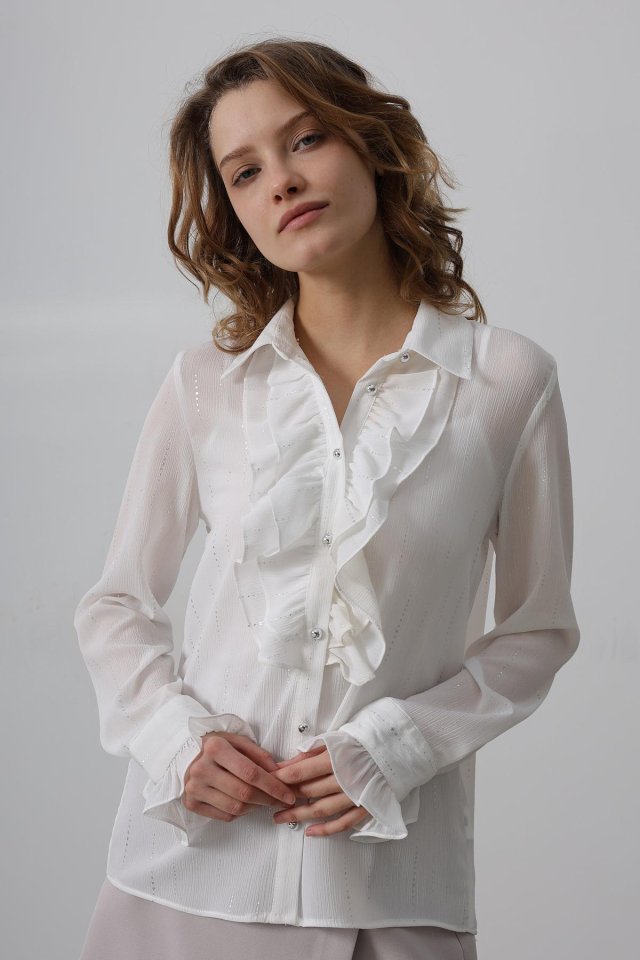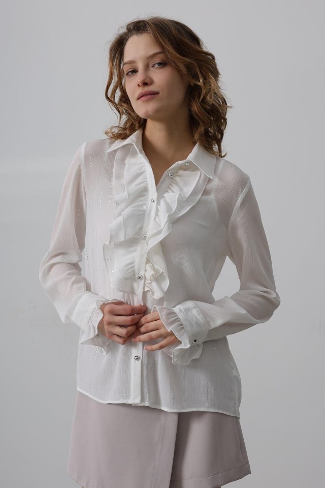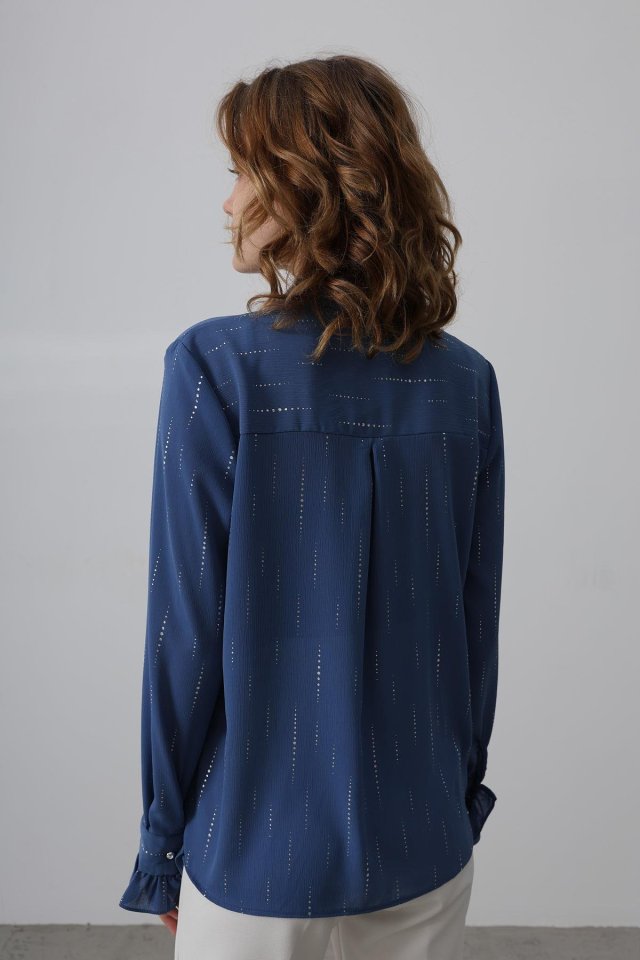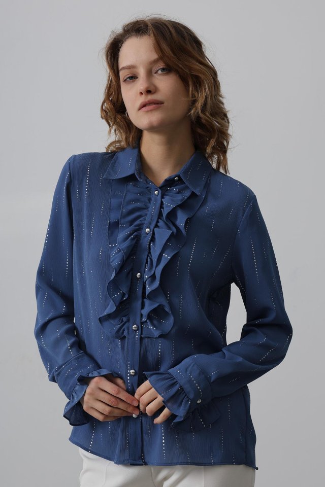 Fırfır Yakalı Şifon Gömlek - Mavi