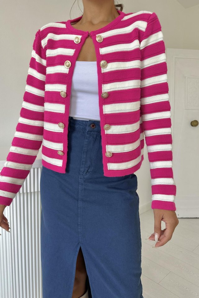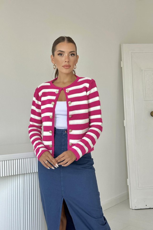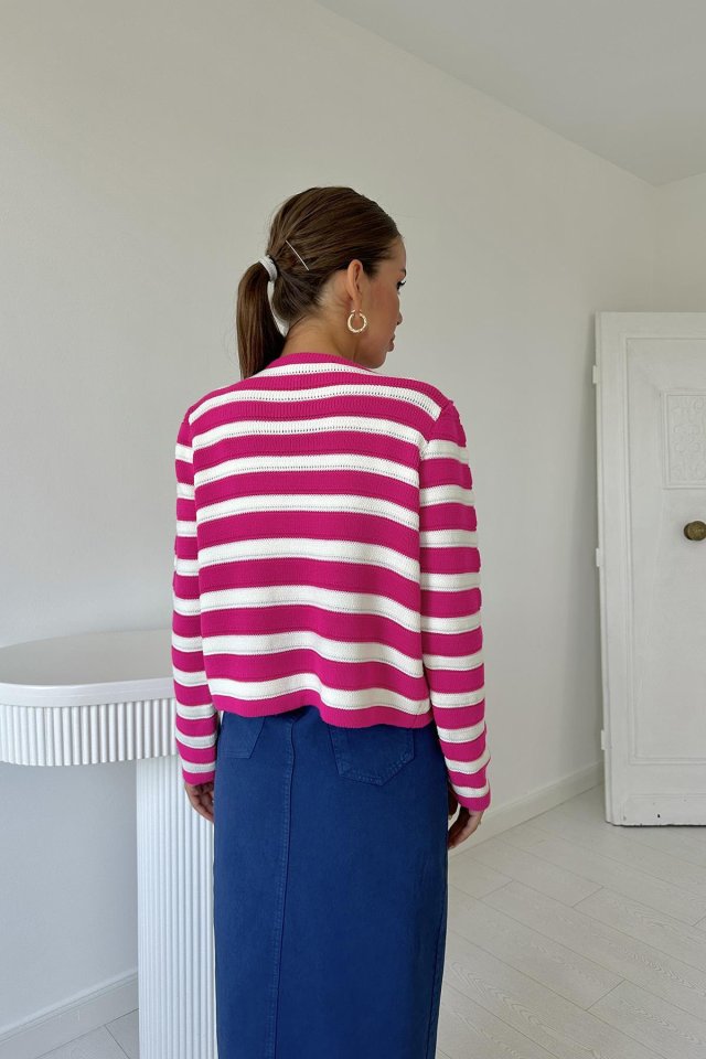 Fuşya Çizgili Ve Düğmeli Triko Kazak