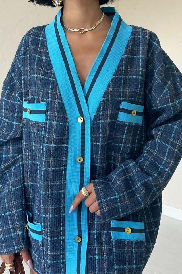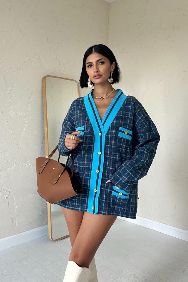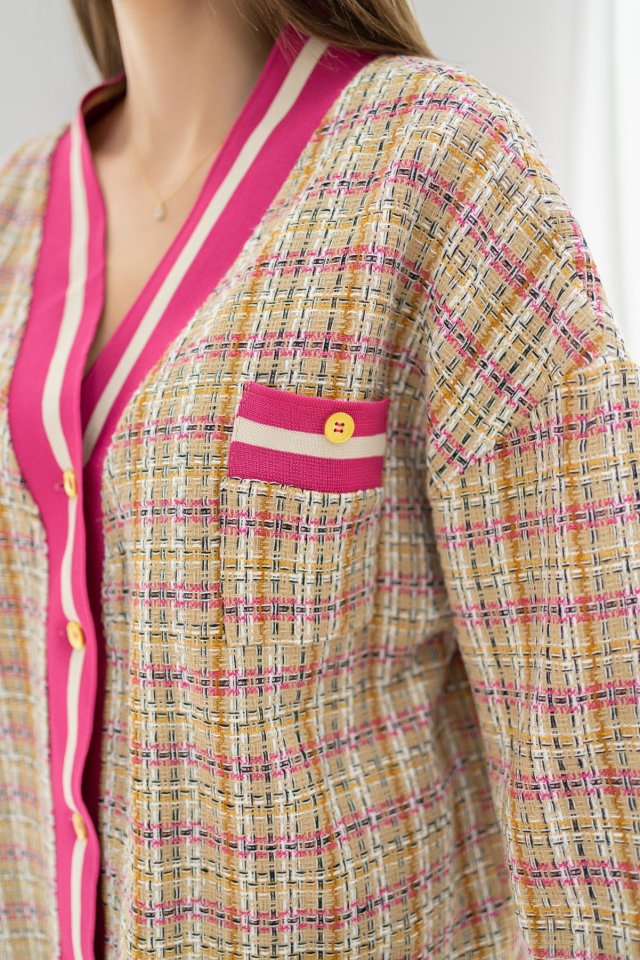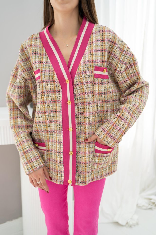 Fuşya Ön Ribana Ekose Ceket