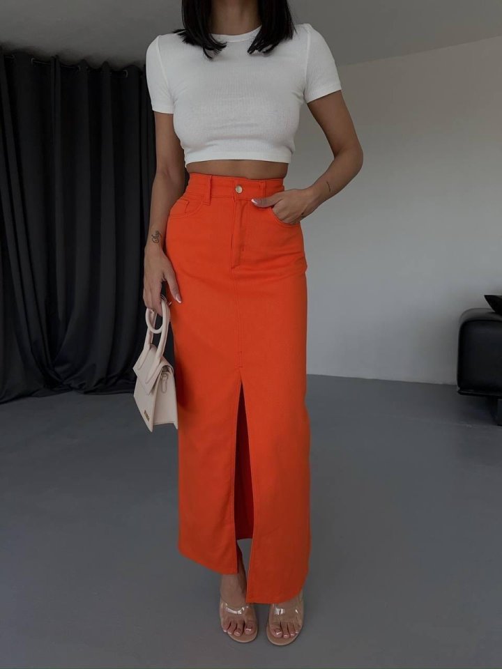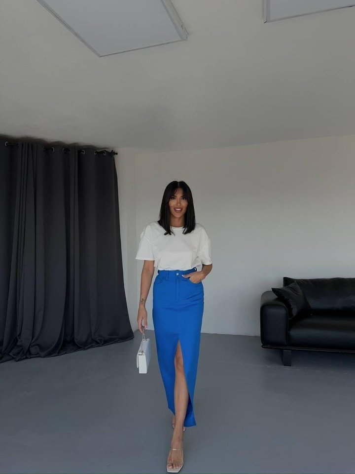 GABARDİN UZUN ÖNDEN YIRTMAÇLI ETEK - Saks