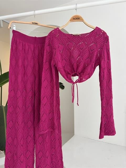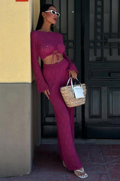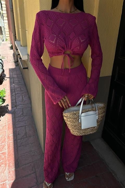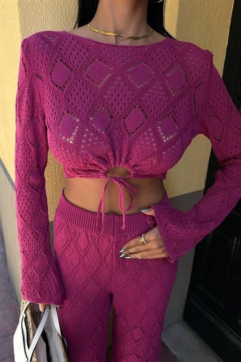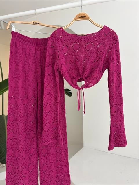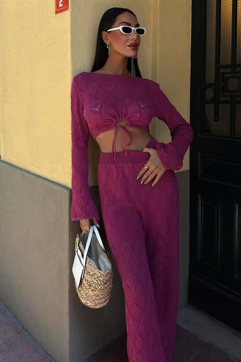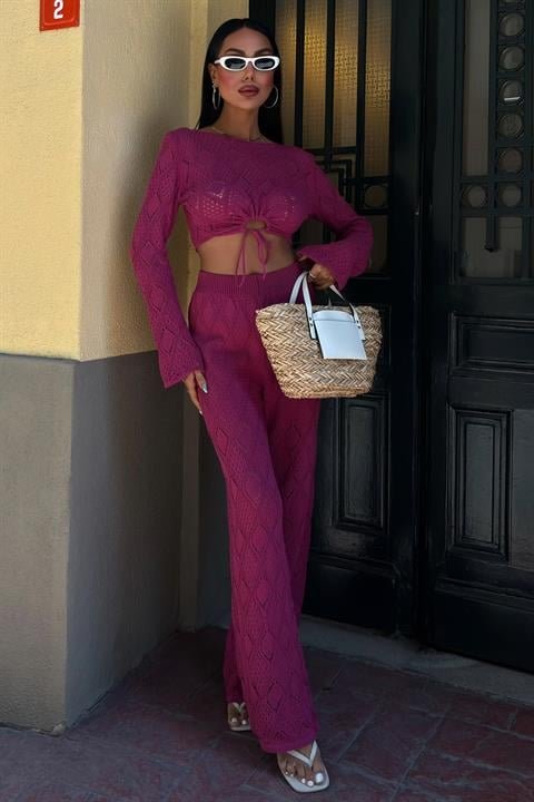 Göğüs Bağcık Detaylı Ajurlu Bluz Pantolon Takım 10098