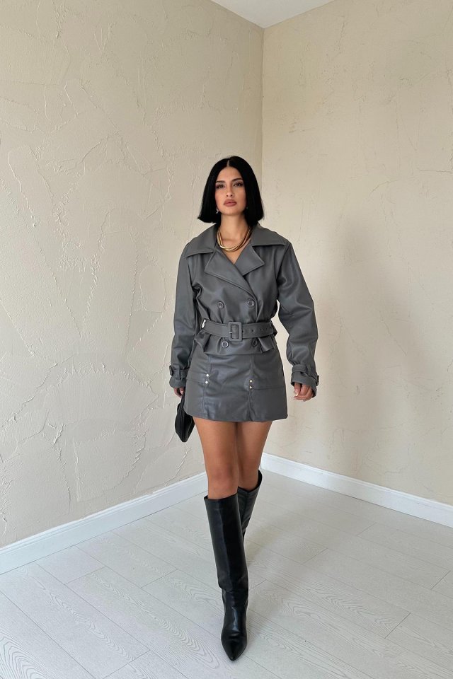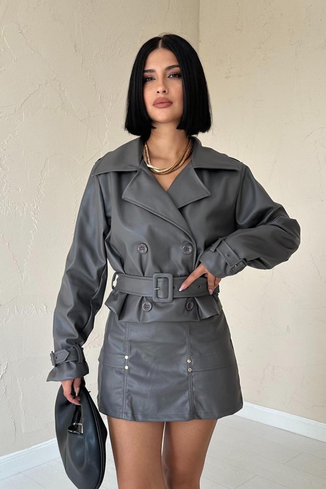 Gri Kemerli Deri Ceket