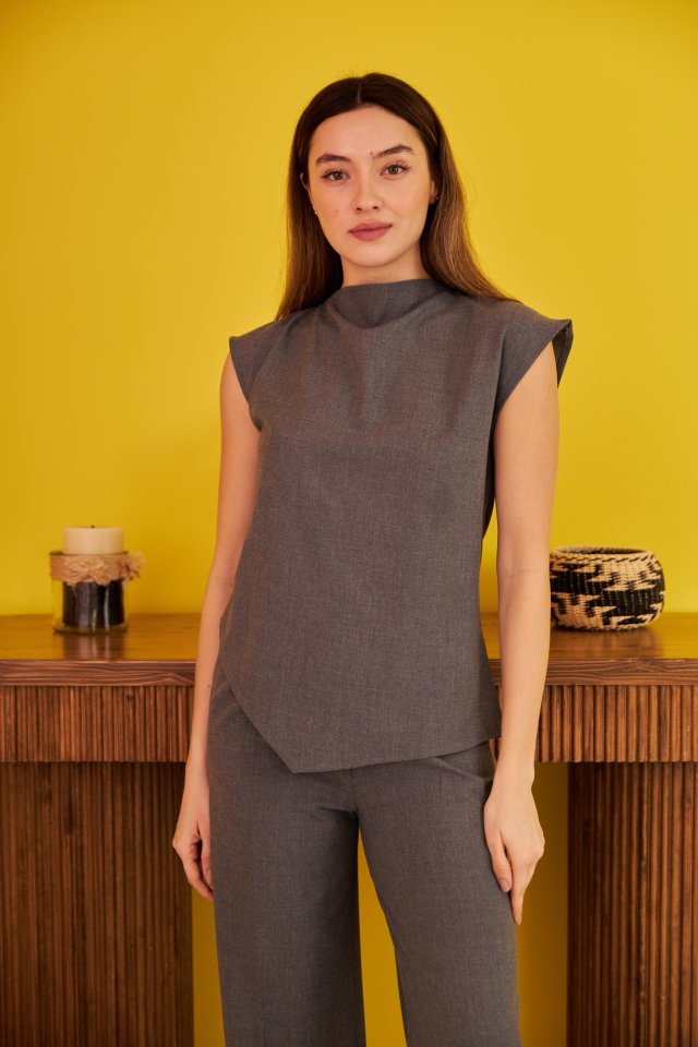 Gri Sıfır Kol Düğmeli Gömlek Takım