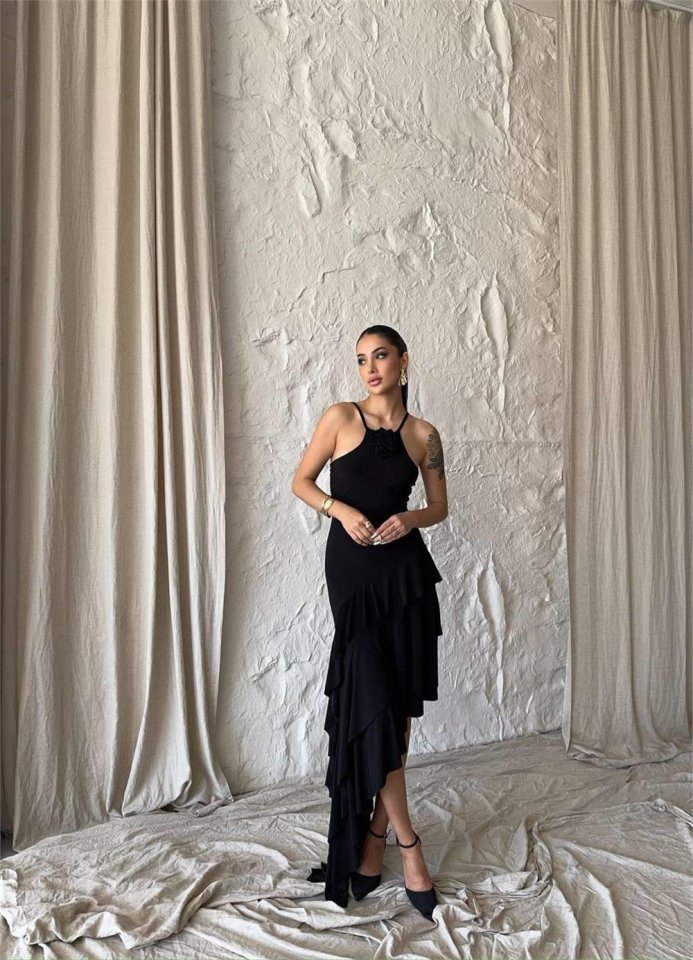 GÜLLÜ ELBİSE ASİMETRİK KATLI - Siyah