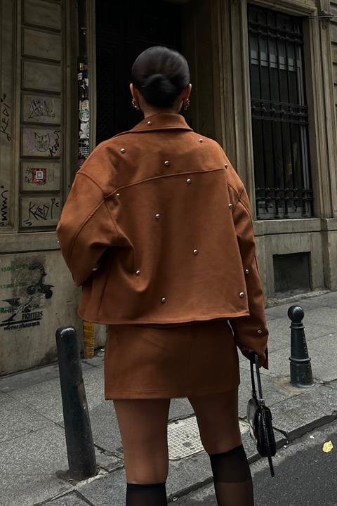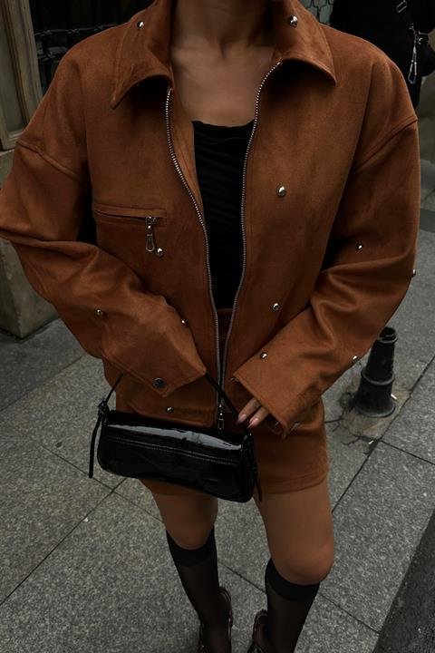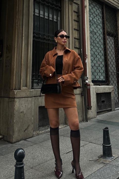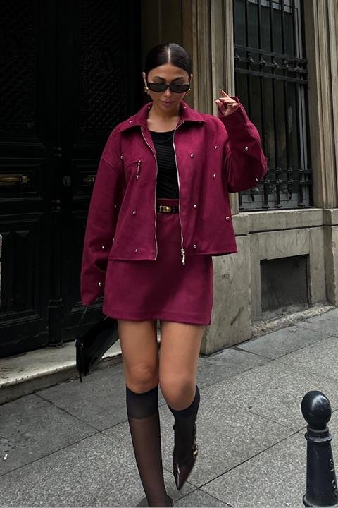Gümüş Aksesuarlı Ceket Etek İçi Astarlı Süet Takım 10000