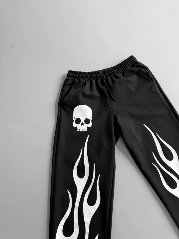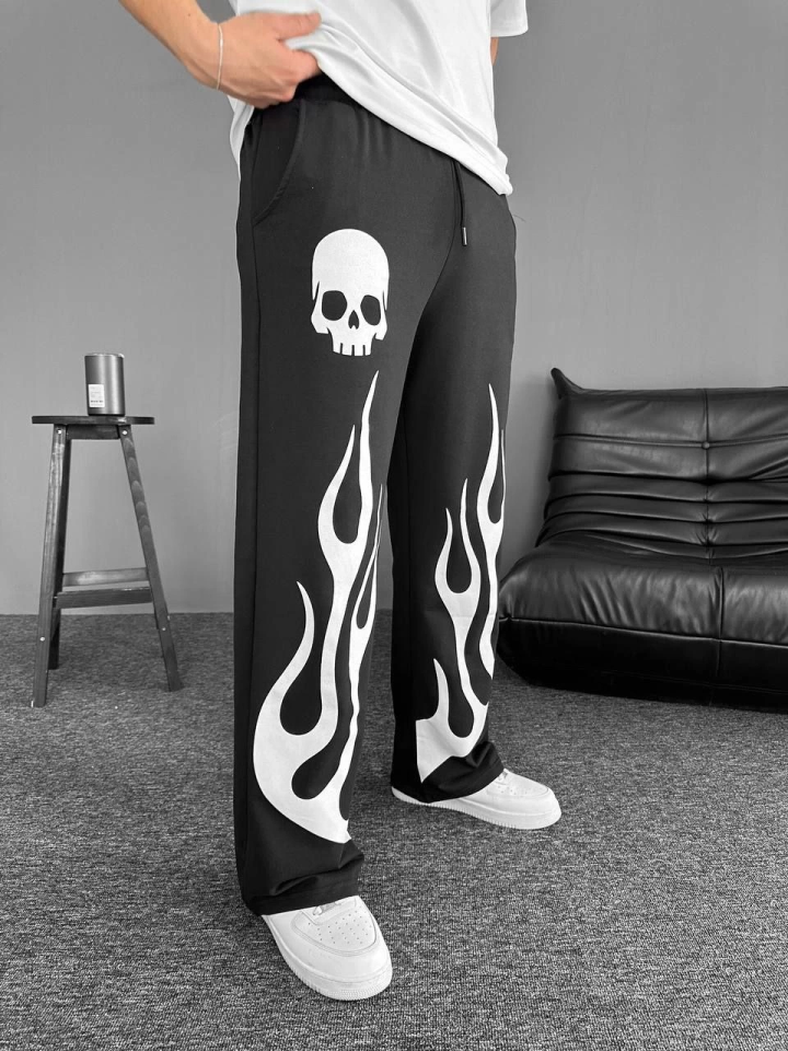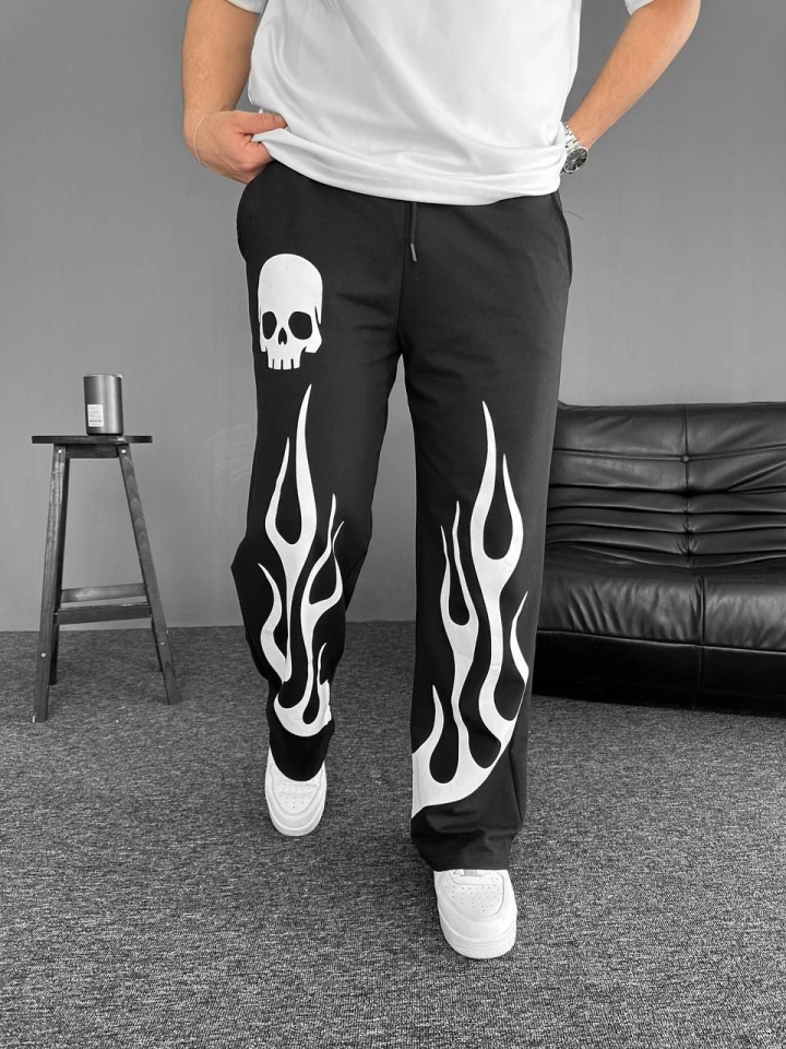 İki İplik Baskılı Kumaş Baggy Alt Esofman - Siyah