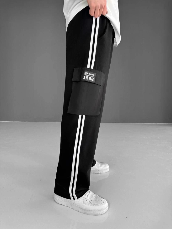 İki İplik Kumaş Kargo Cepli Şeritli Alt Esofman - Siyah