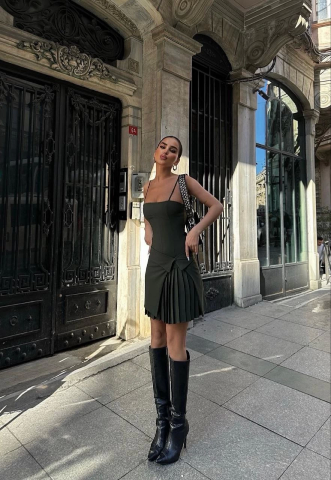 İki Parçalı Pileli Askılı Mini Elbise - Haki