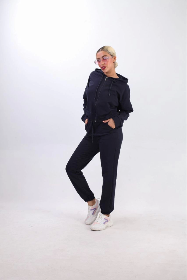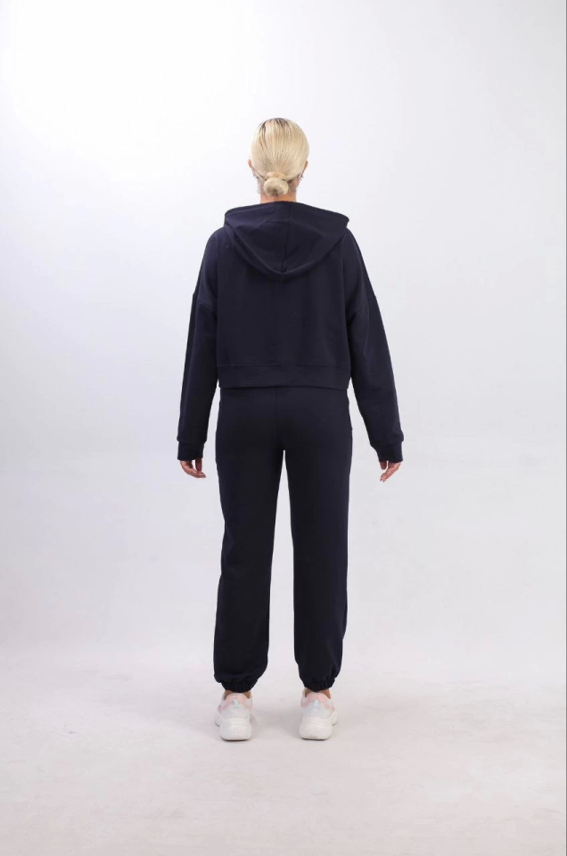 Iki Iplik Kapüşonlu Fermuarlı Crop Oversize Hırka Takım- Lacivert