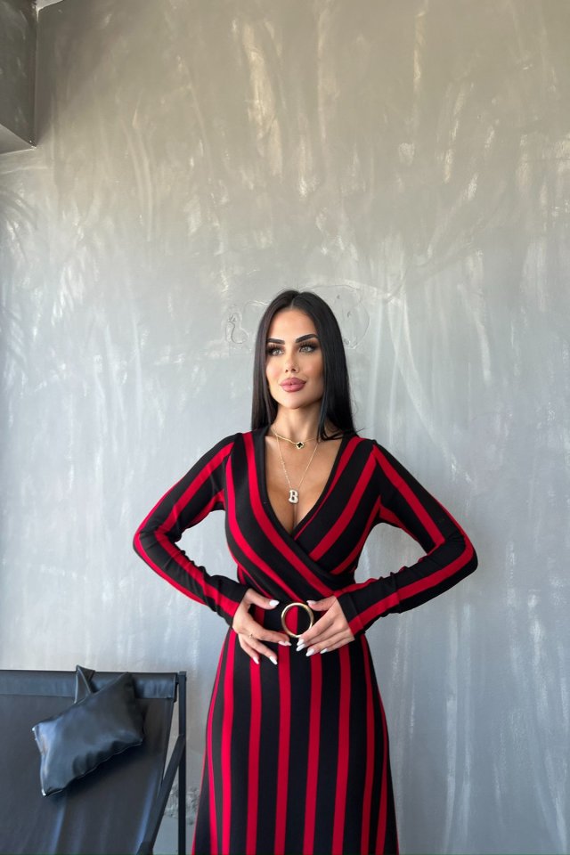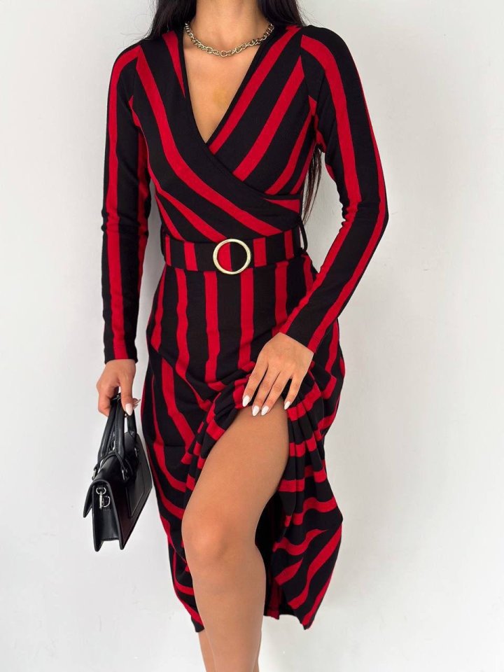 Kadın Akrilik Kumaş Kruvaze Yaka Kemerli Uzun Kollu çizgili Midi Boy Elbise