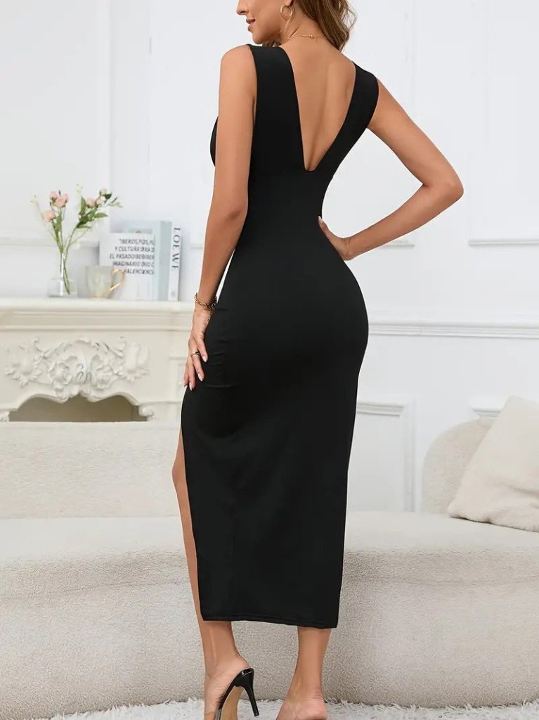 Kadın Askılı Derin V Dekolteli Yırtmaçlı Janjan Krep Elbise