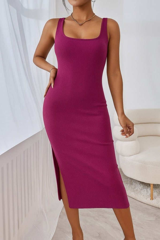 Kadın Askılı Kare Yaka Yandan Yırtmaçlı Midi Kaşkorse Elbise