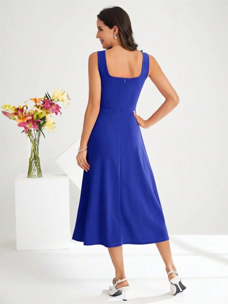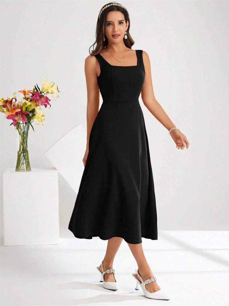 Kadın Askılı Kare Yakalı Midi Ithal Krep Elbise