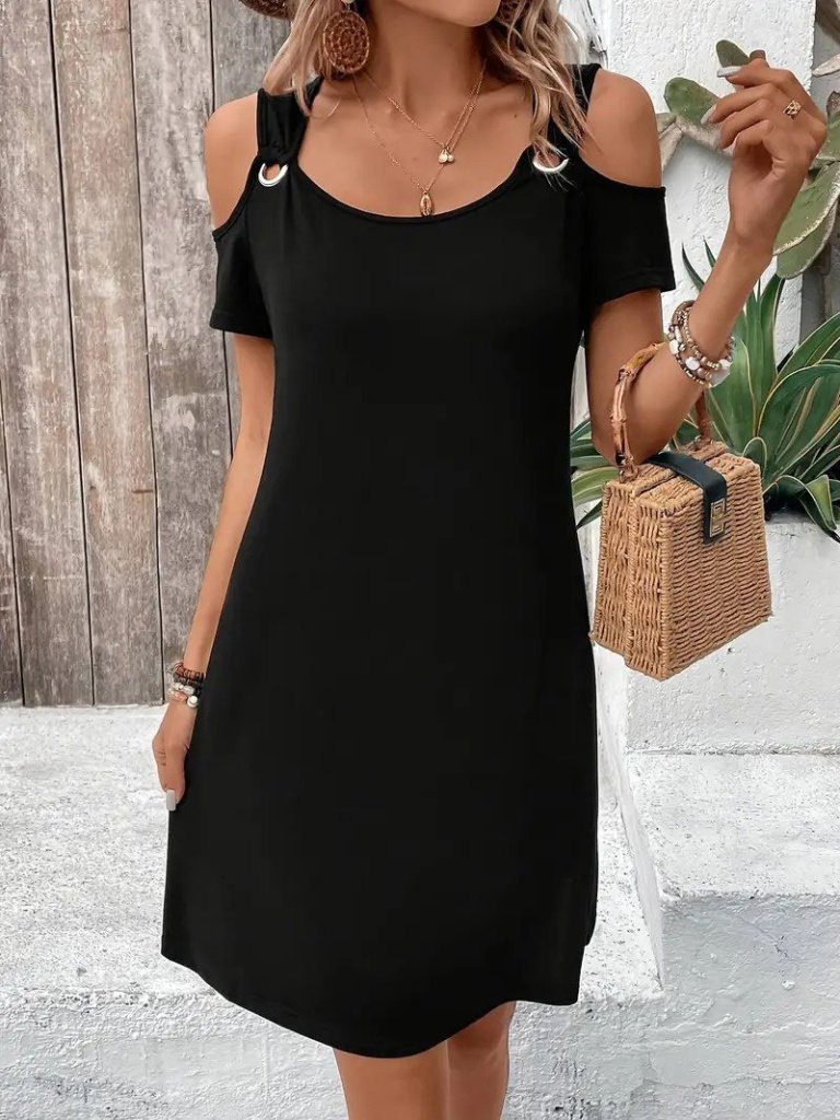 Kadın Askılı Omuzlardan Açık Kısa Kollu Kuş Gözü Detaylı Viskon Elbise