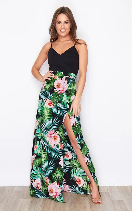 Kadın Askılı V Yaka Eteği Dijital Baskılı Dalmaçya Desen Yırtmaçlı Mikro Kumaş Elbise