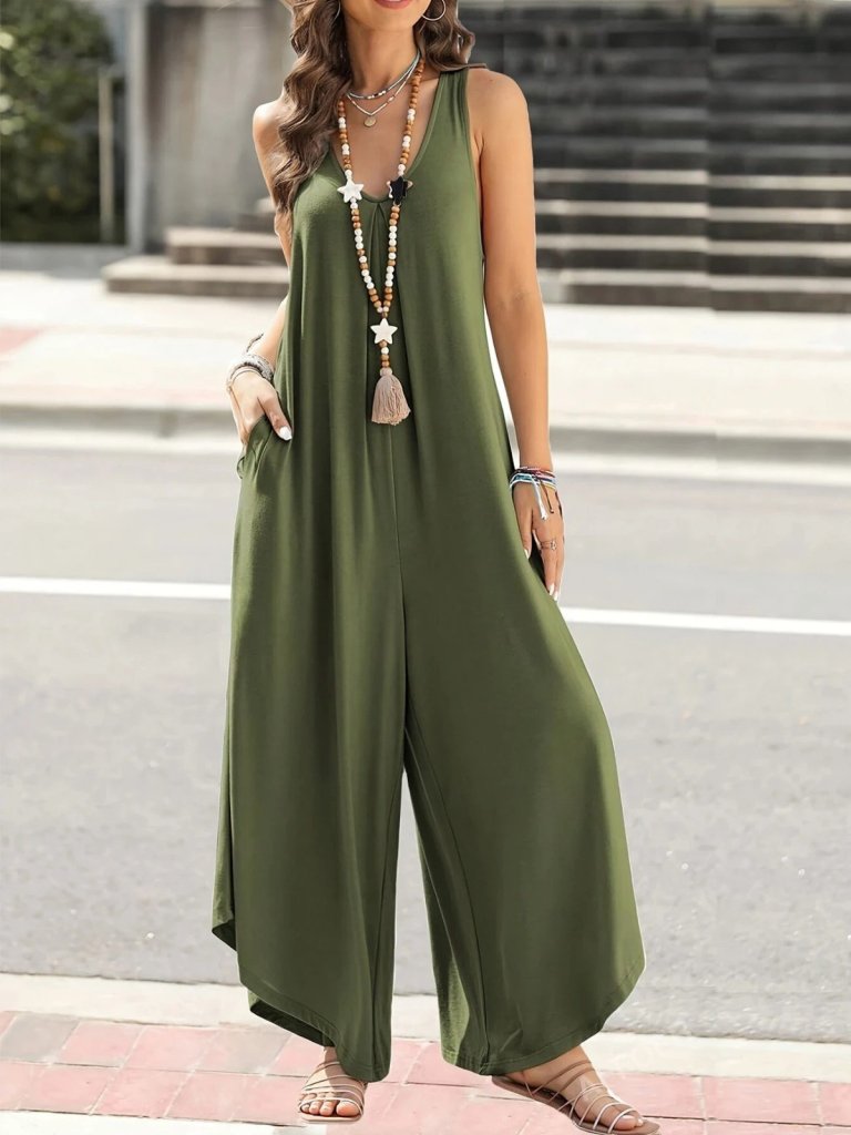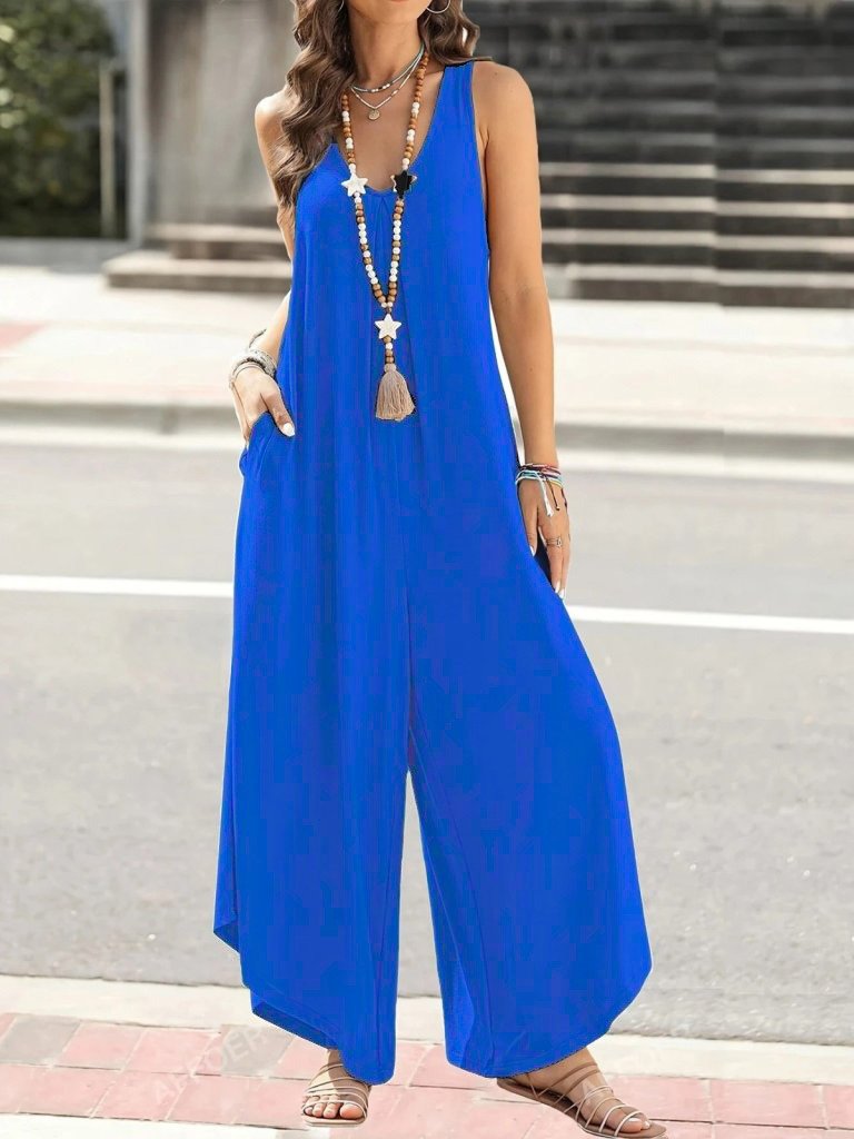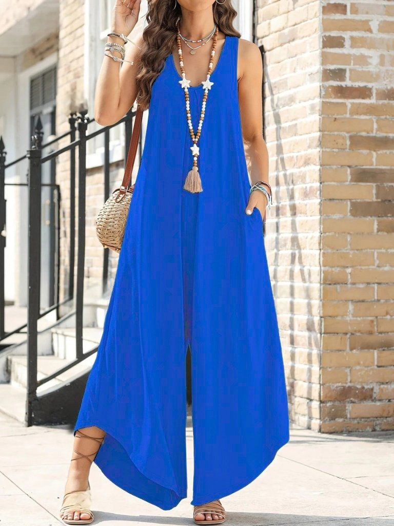 Kadın Askılı Yuvarlak Yaka Cepli Salaş Uzun Viskon Tulum