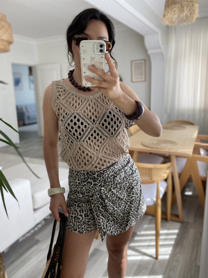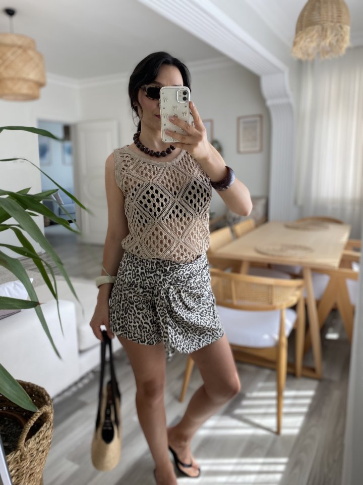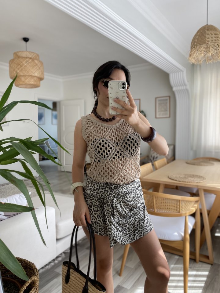 Kadın Askılı Yuvarlak Yaka Geometrik Desenli Triko Bluz