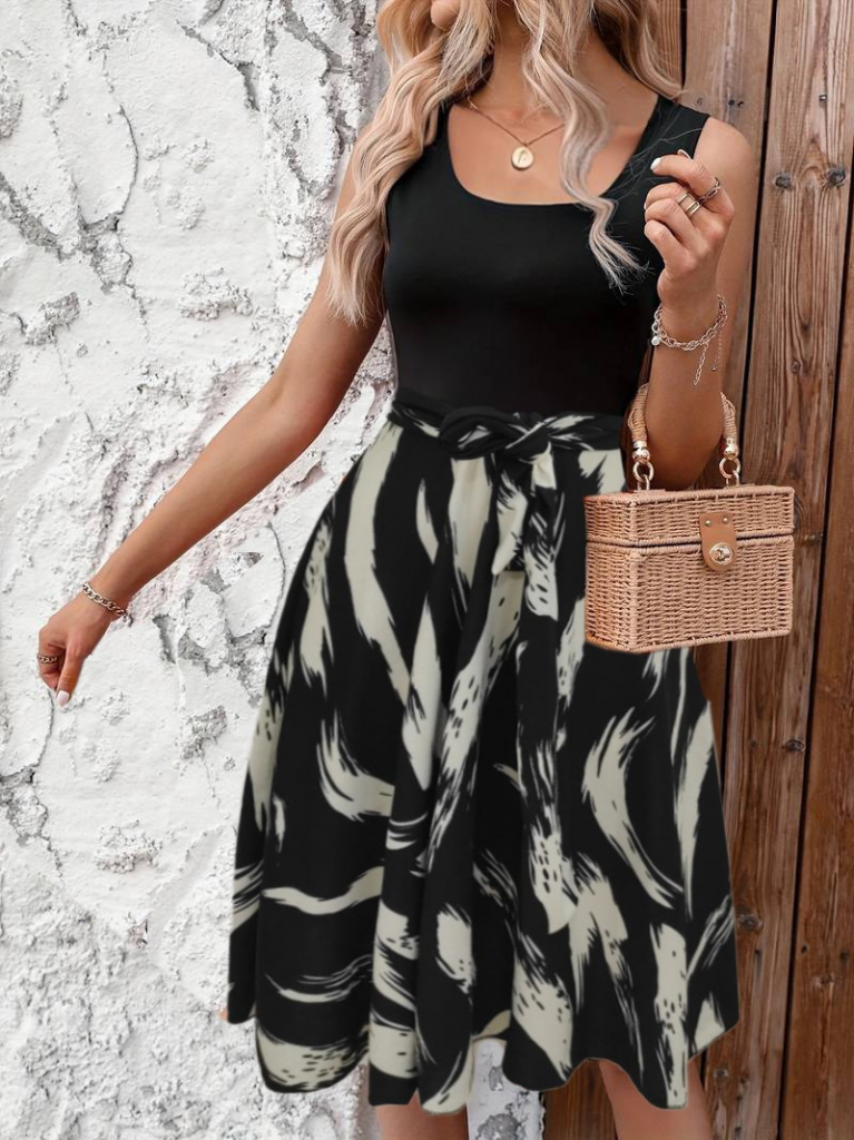 Kadın Askılı Yuvarlak Yakalı Belden Kuşaklı Zikzak Desenli Süprem Elbise
