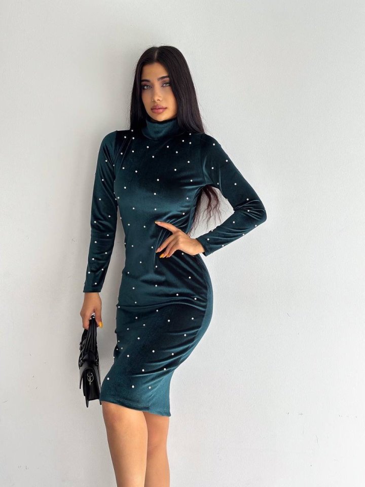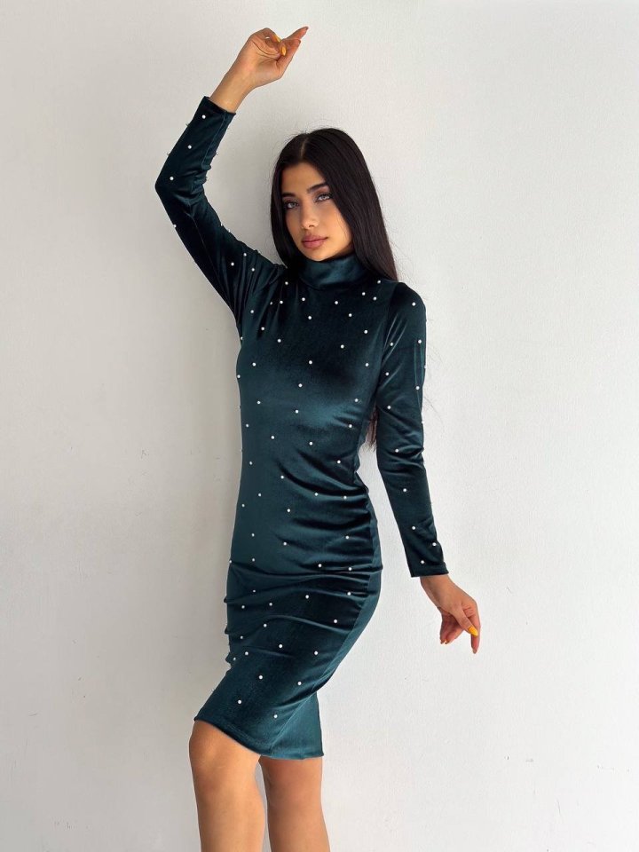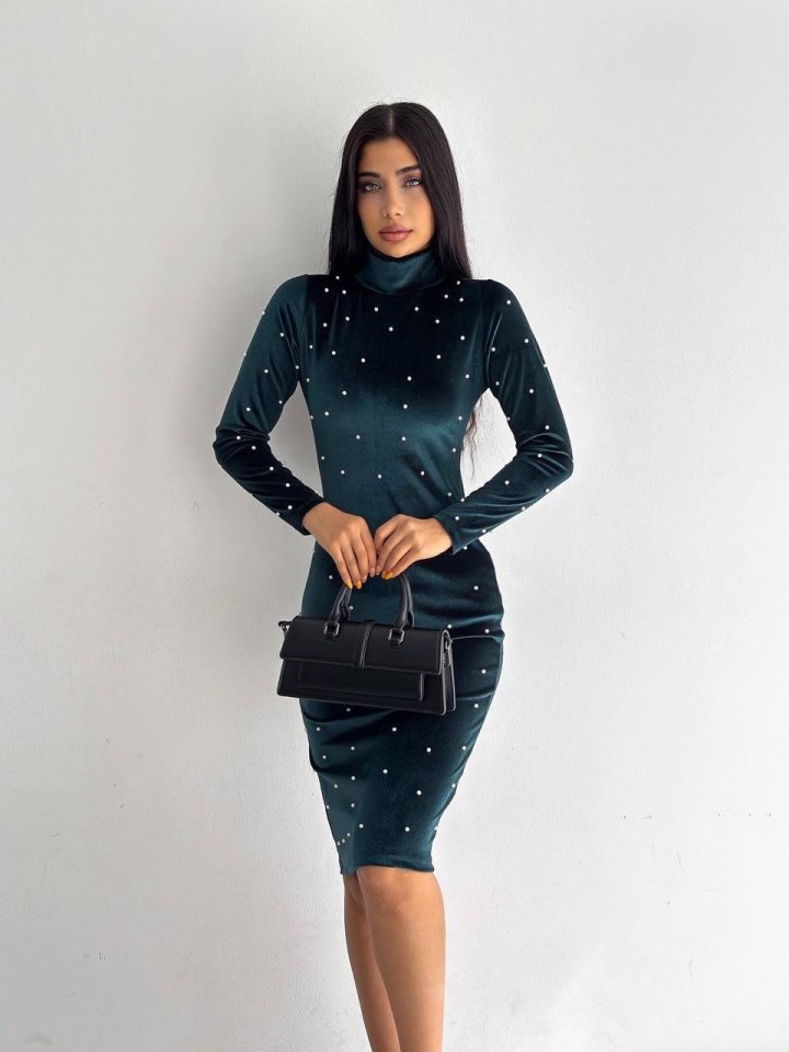 Kadın Balıkçı Yaka Inci Detay Fırsat ürün Kadife Kumaş Mini Elbise