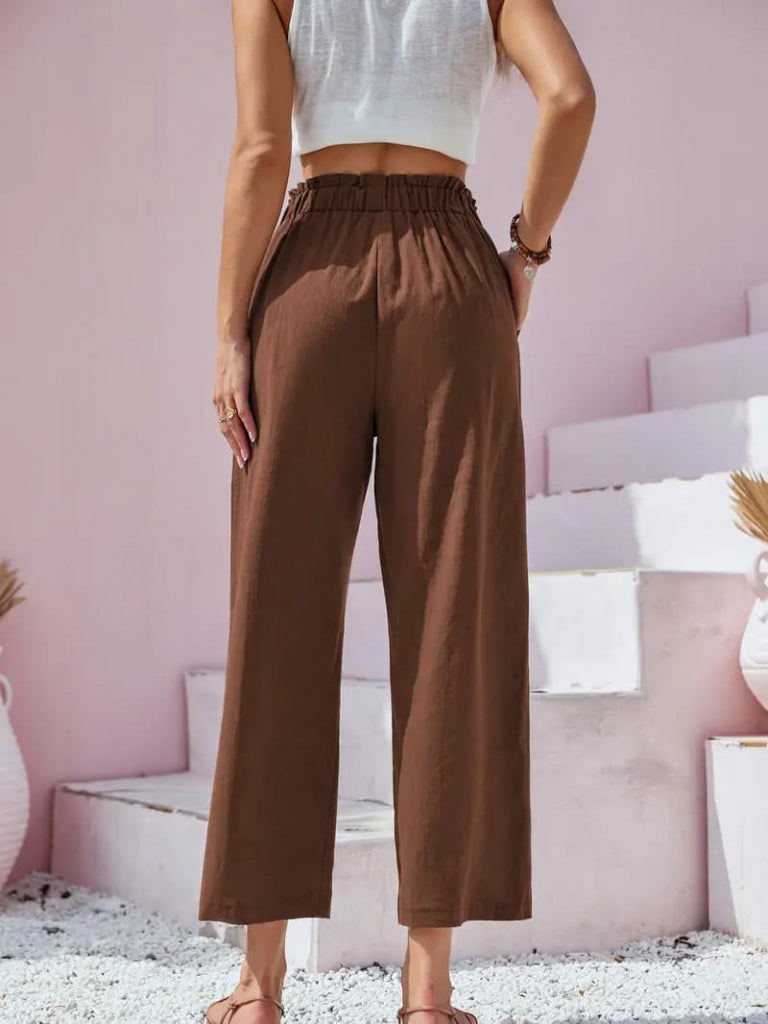 Kadın Bel Büzgü Ve Düğme Detay Kısa Geniş Paça Keten Pantolon