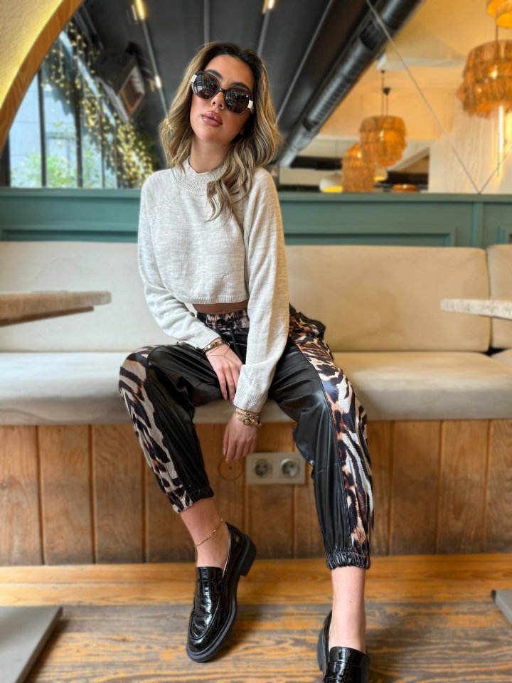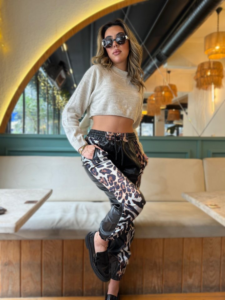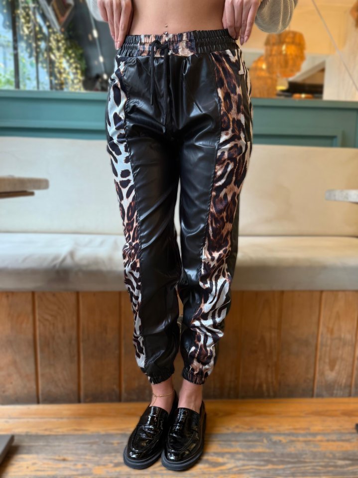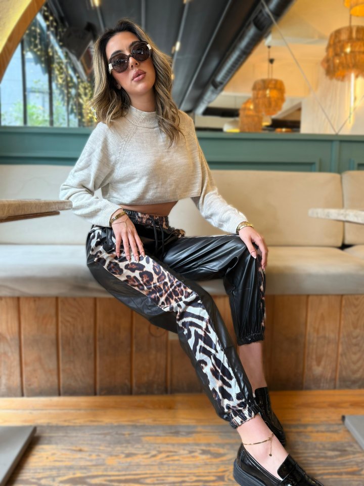 Kadın Bel Ve Paça Lastikli Detay Yanları Leopar Detay Bağcıklı Deri Pantolon