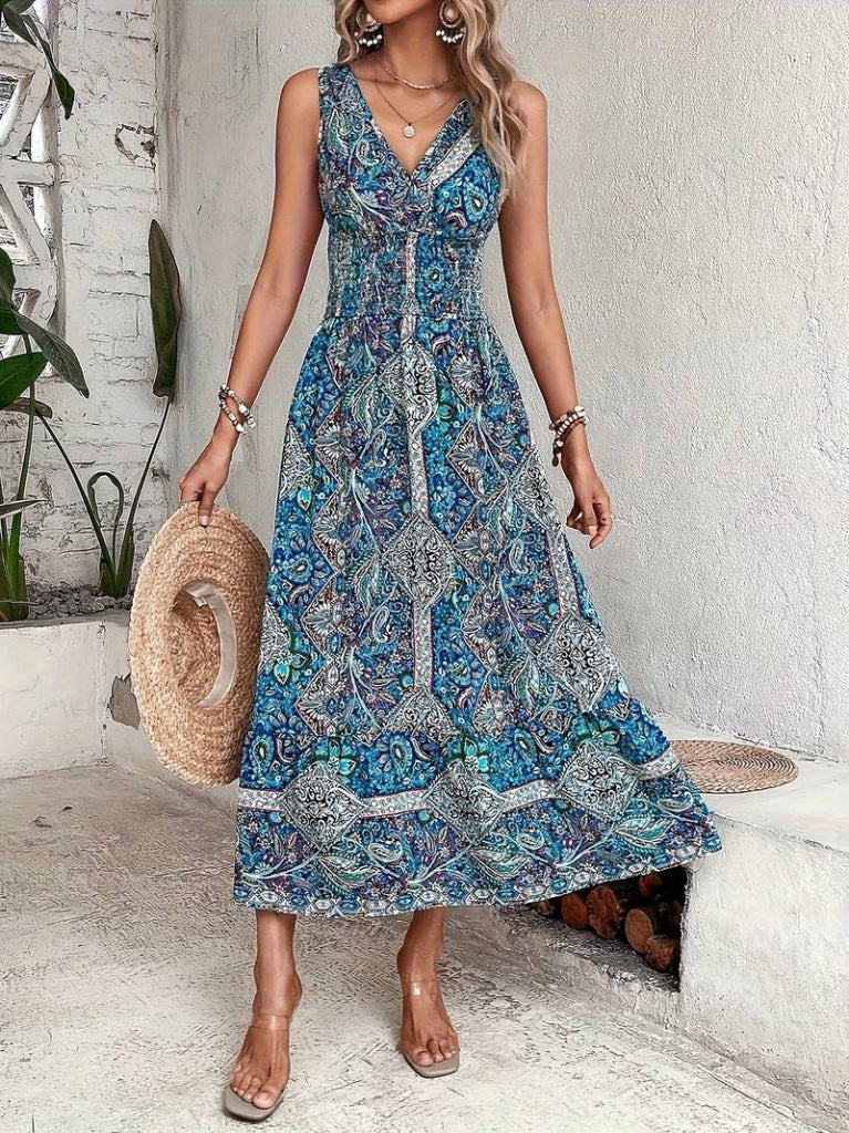 Kadın Beli Gipeli Etnik Desen Sıfır Kol Süprem Elbise