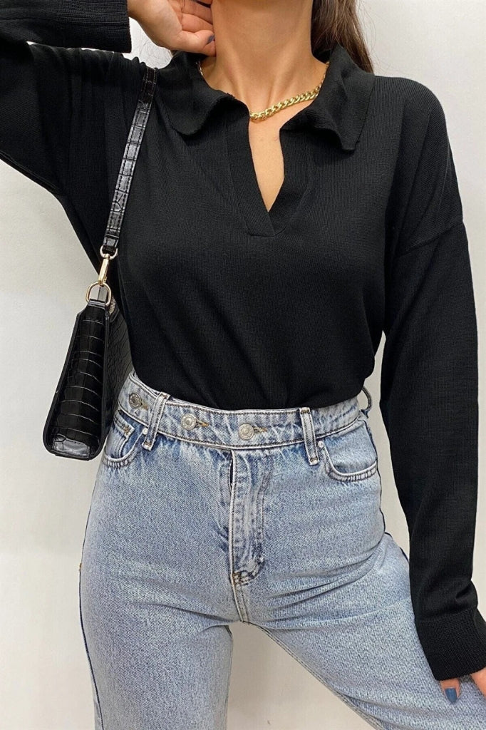 Kadın Beyaz Uzun Kollu Yakalı Triko Bluz