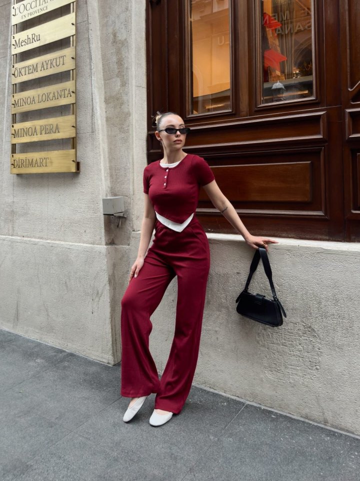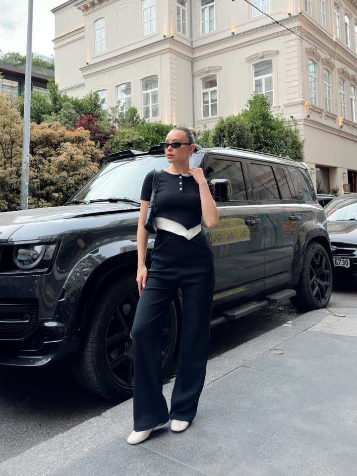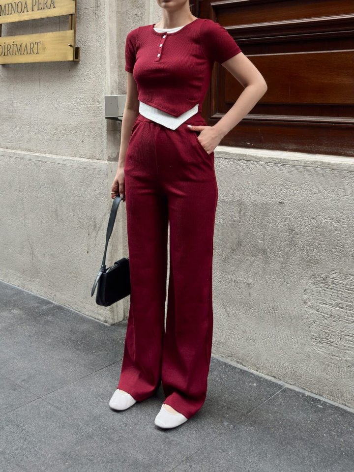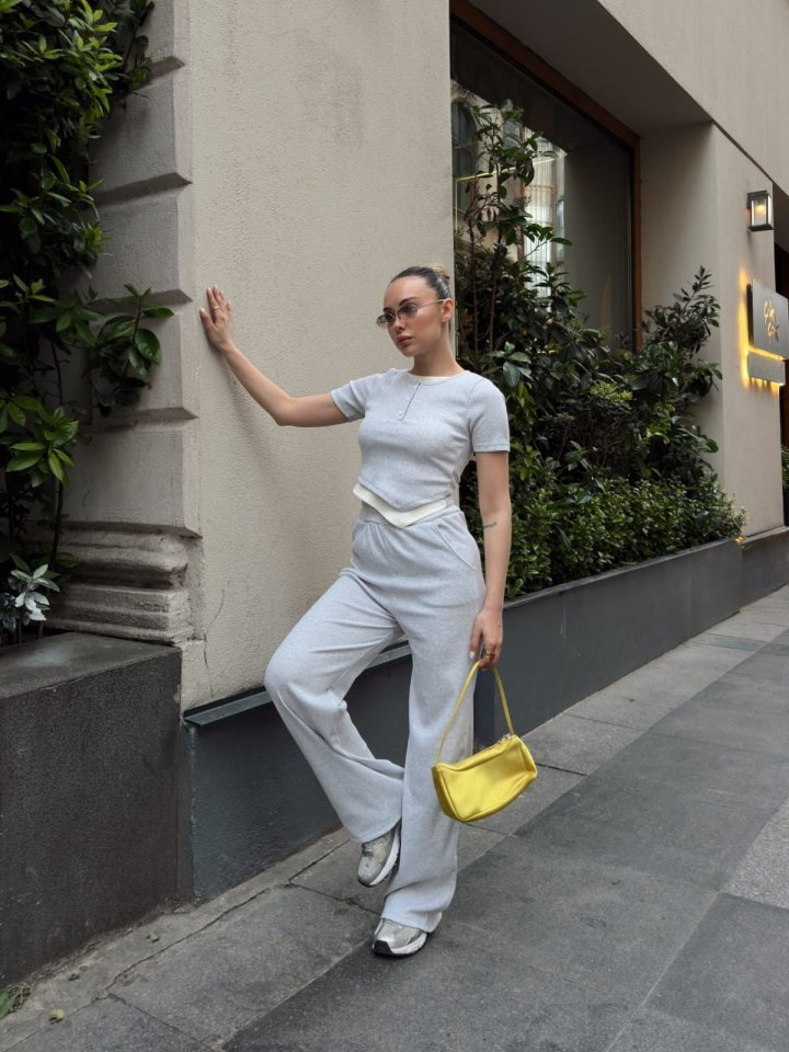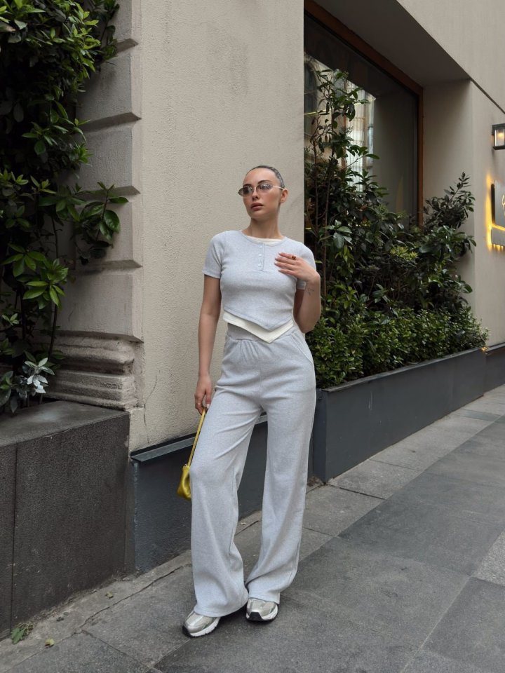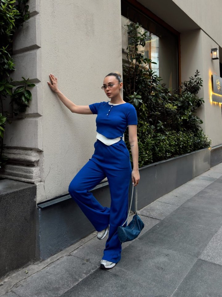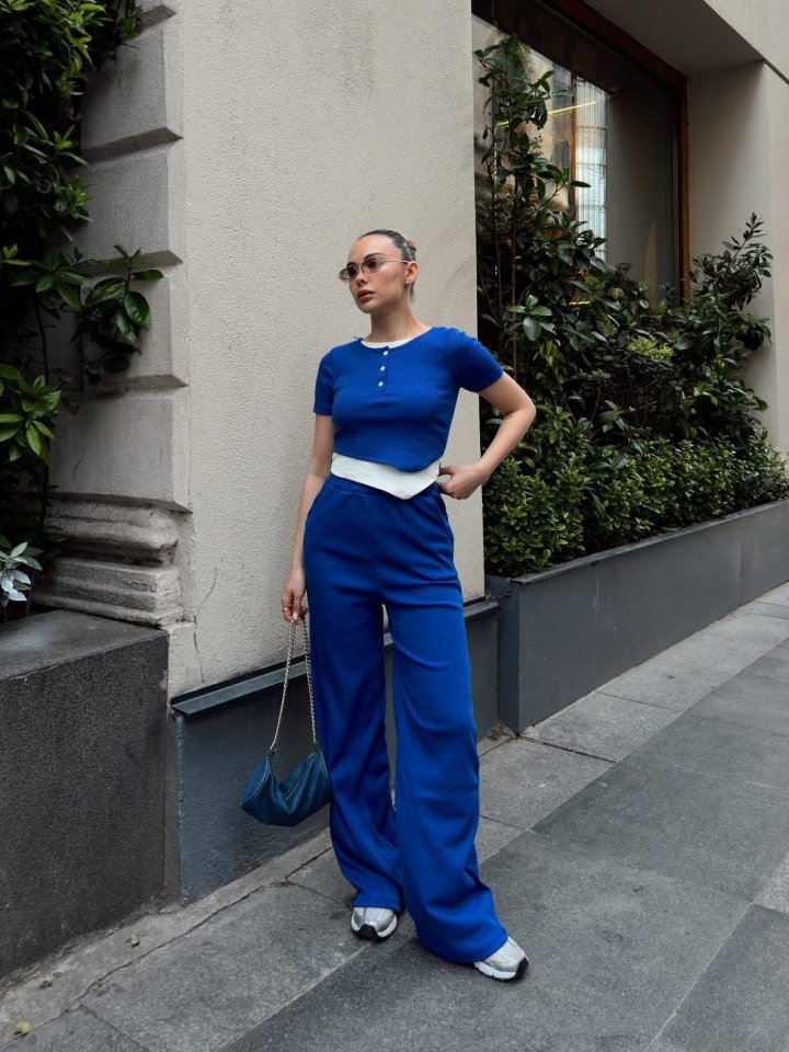 Kadın Bisiklet Yaka Asimetrik Kesim Atlet Detay Bluz Ve Yüksek Bel Bol Paça Pantolon Ikili Takım