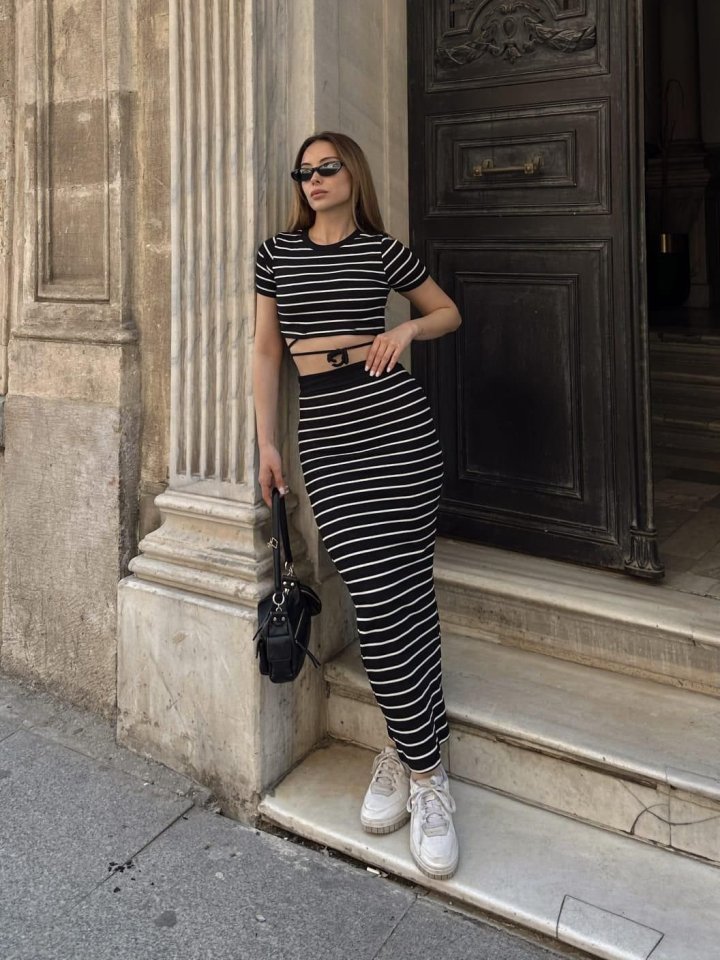 Kadın Bisiklet Yaka Bağcık Detay Crop Ve Yüksek Bel çizgi Desen Etek Ikili Takım