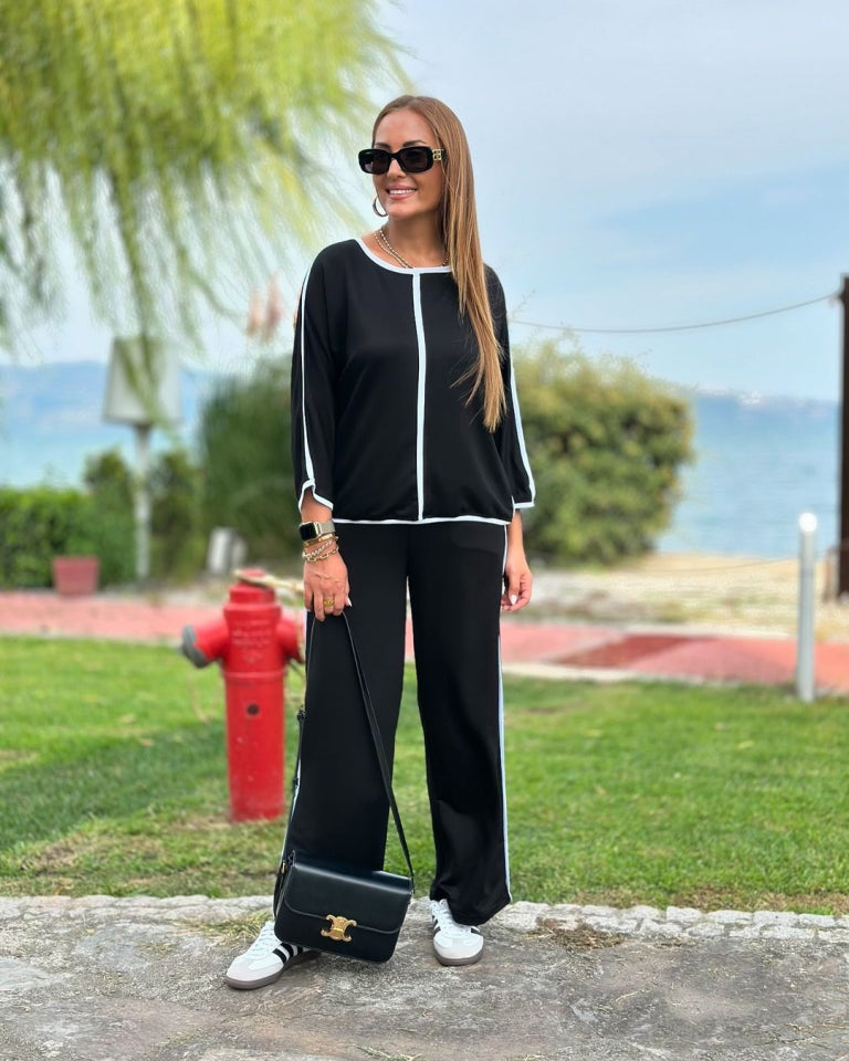 Kadın Bisiklet Yaka Truvakar Kol Biye Detay Bluz Ve Yüksek Bel Lastikli Pantolon Ikili Takım