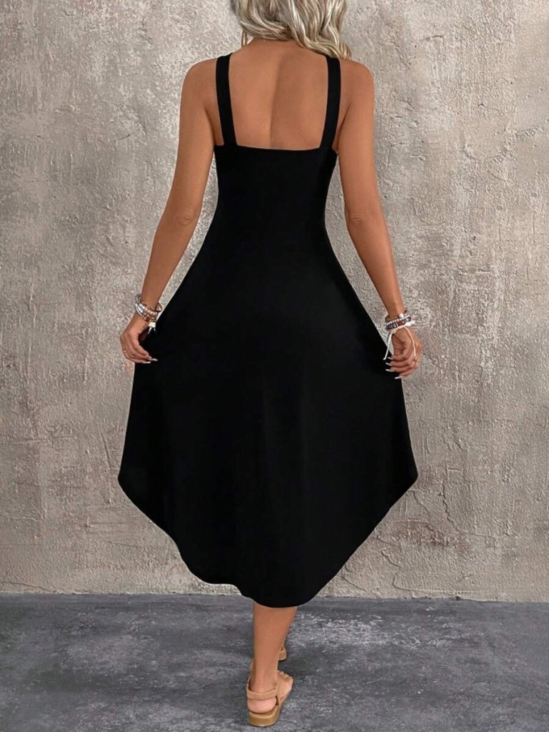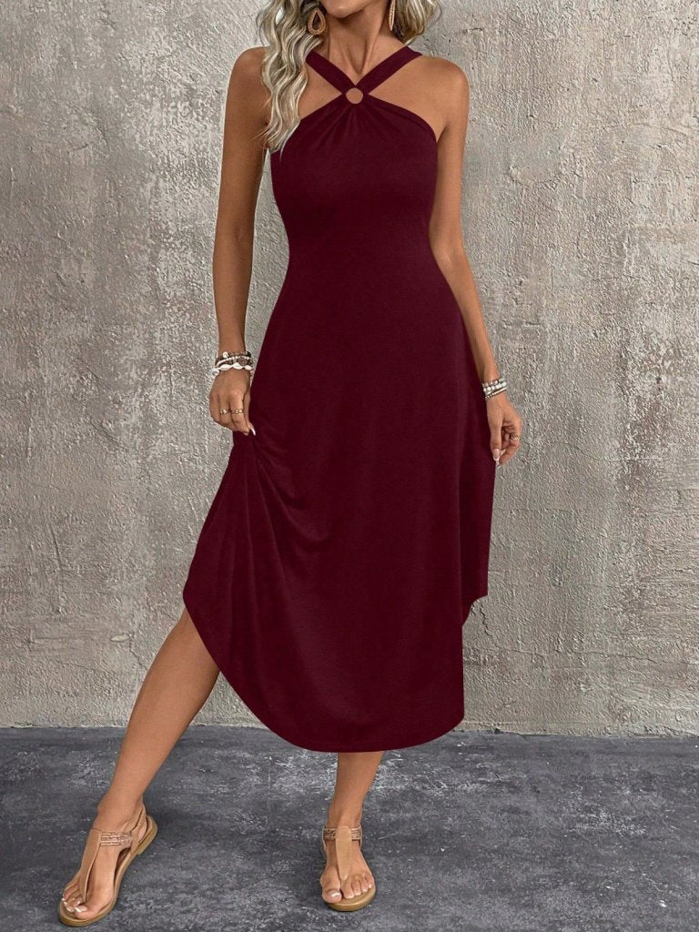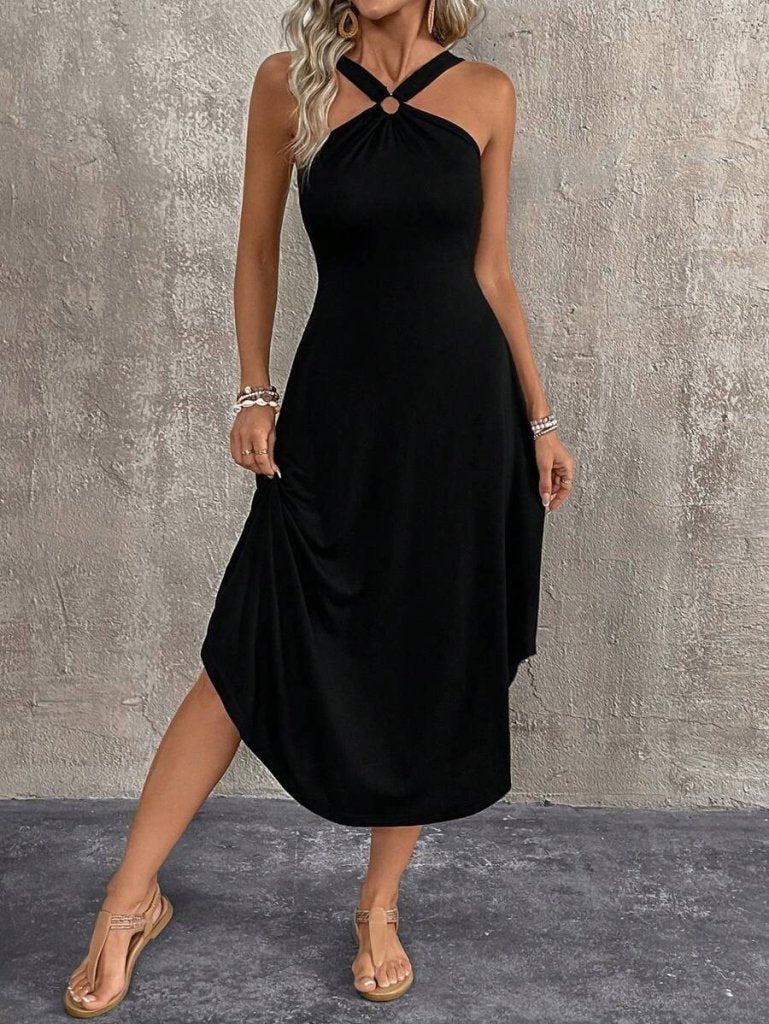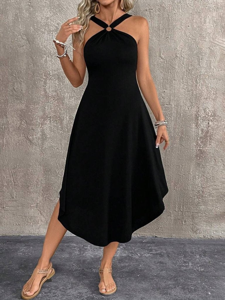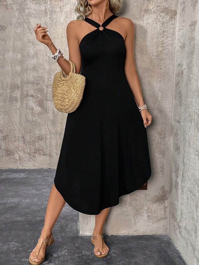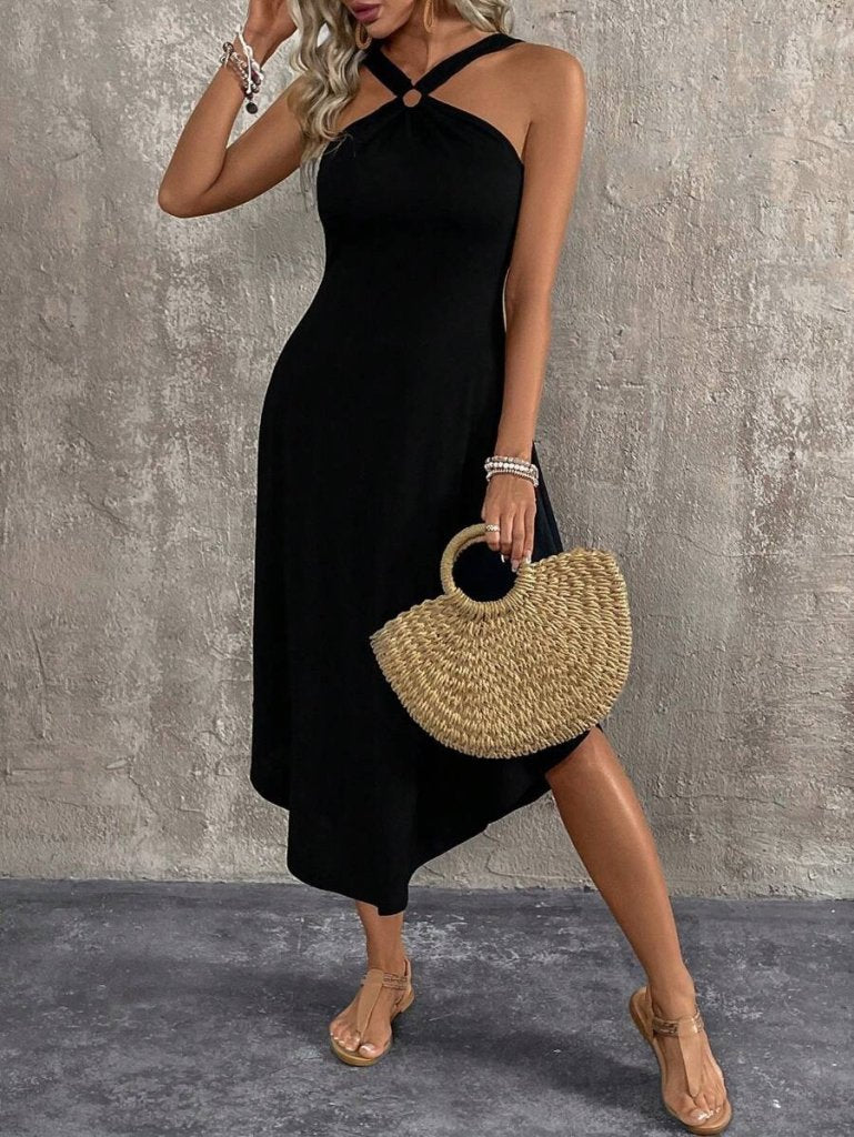 Kadın Boyundan çapraz Askılı Halka Detaylı Asimetrik Kesim Viskon Elbise
