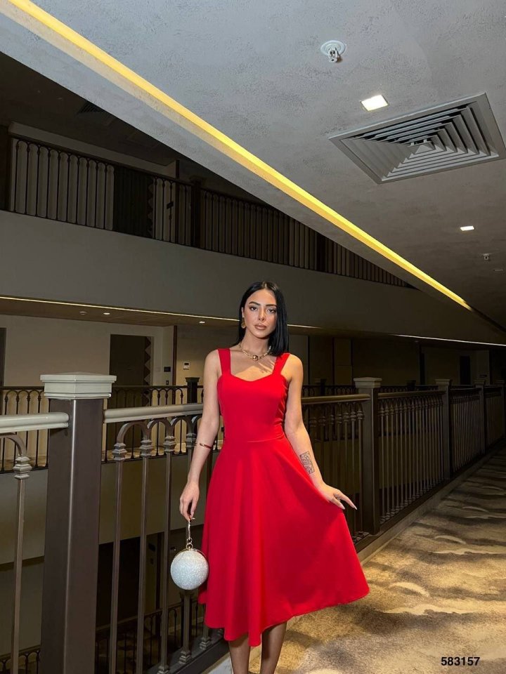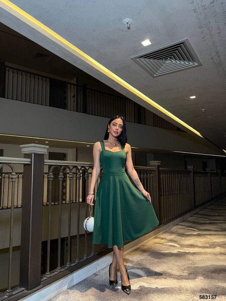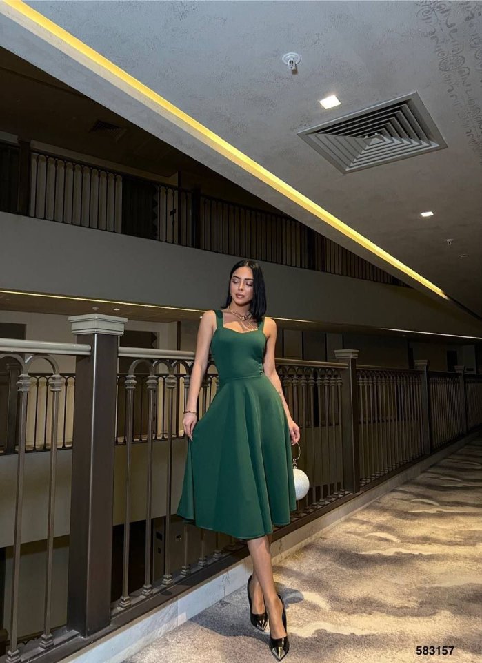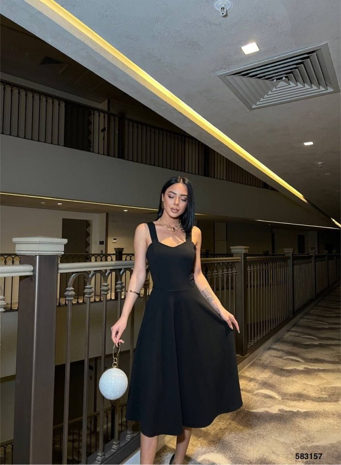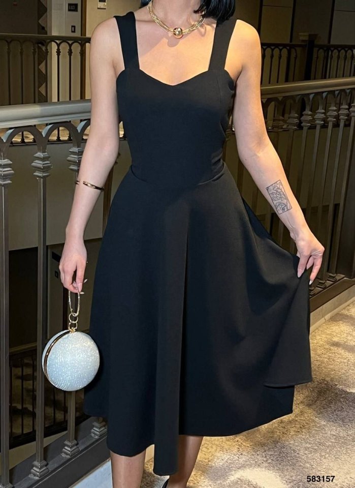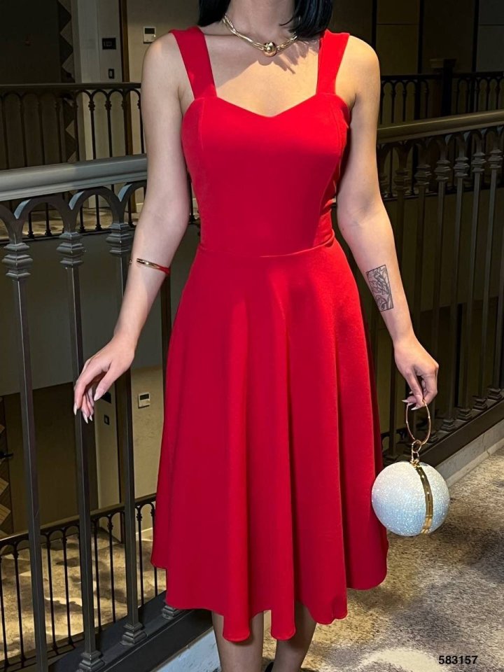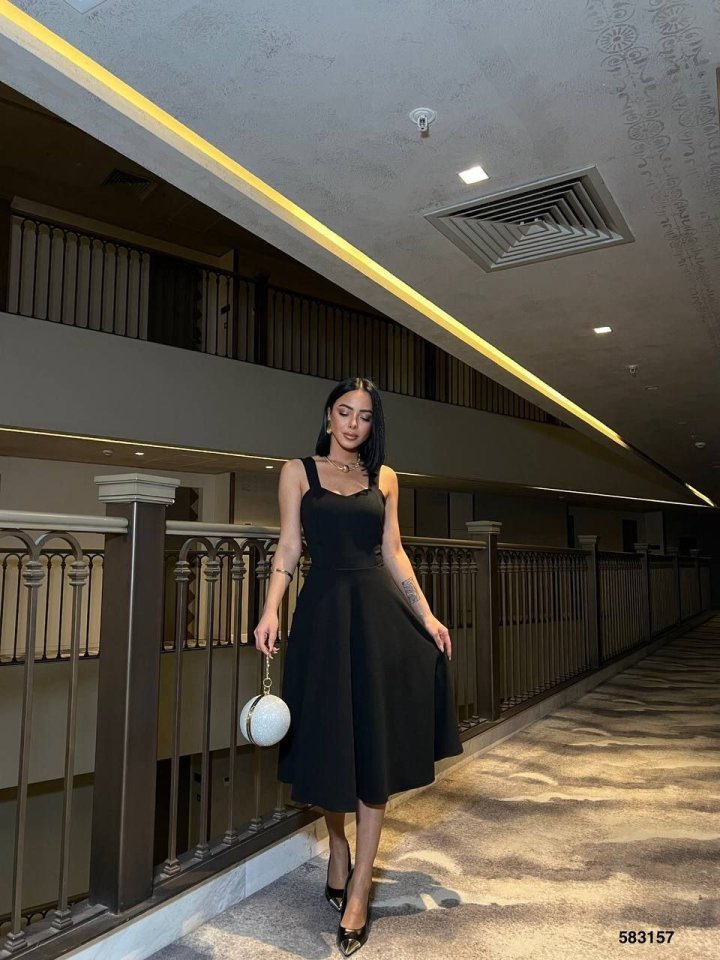 Kadın Dalgıç Krep Kumaş Kalp Yaka Askılı Midi Boy Elbise