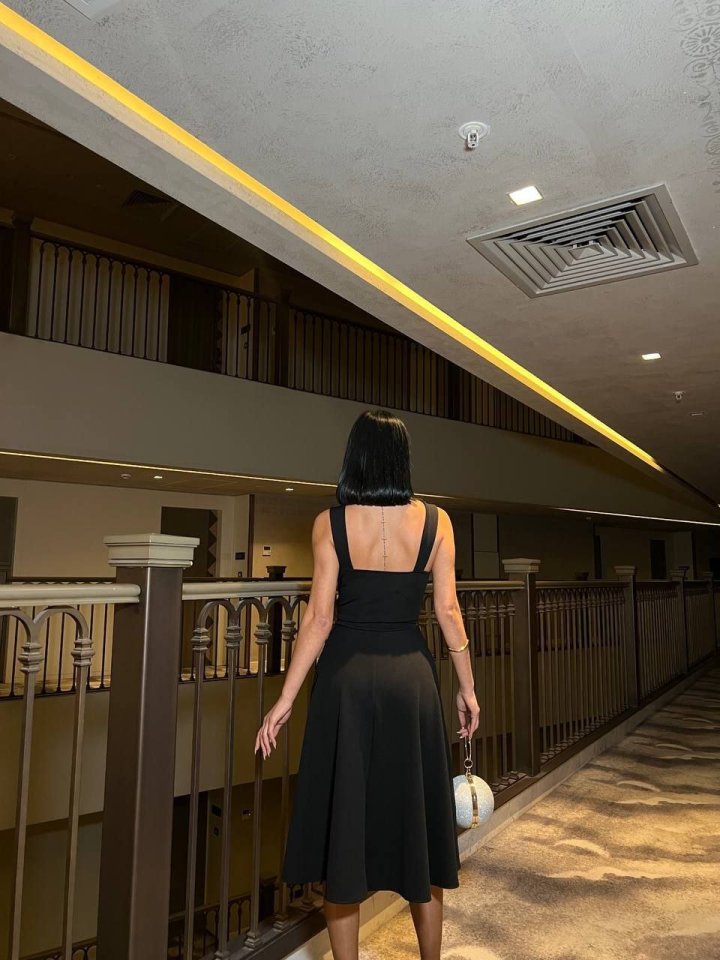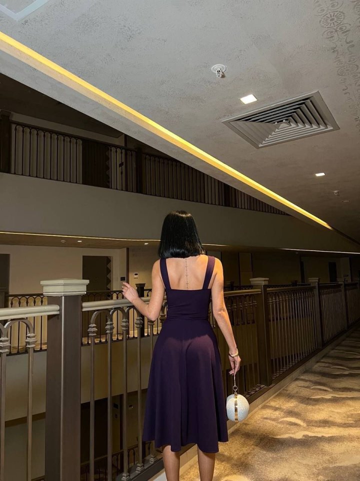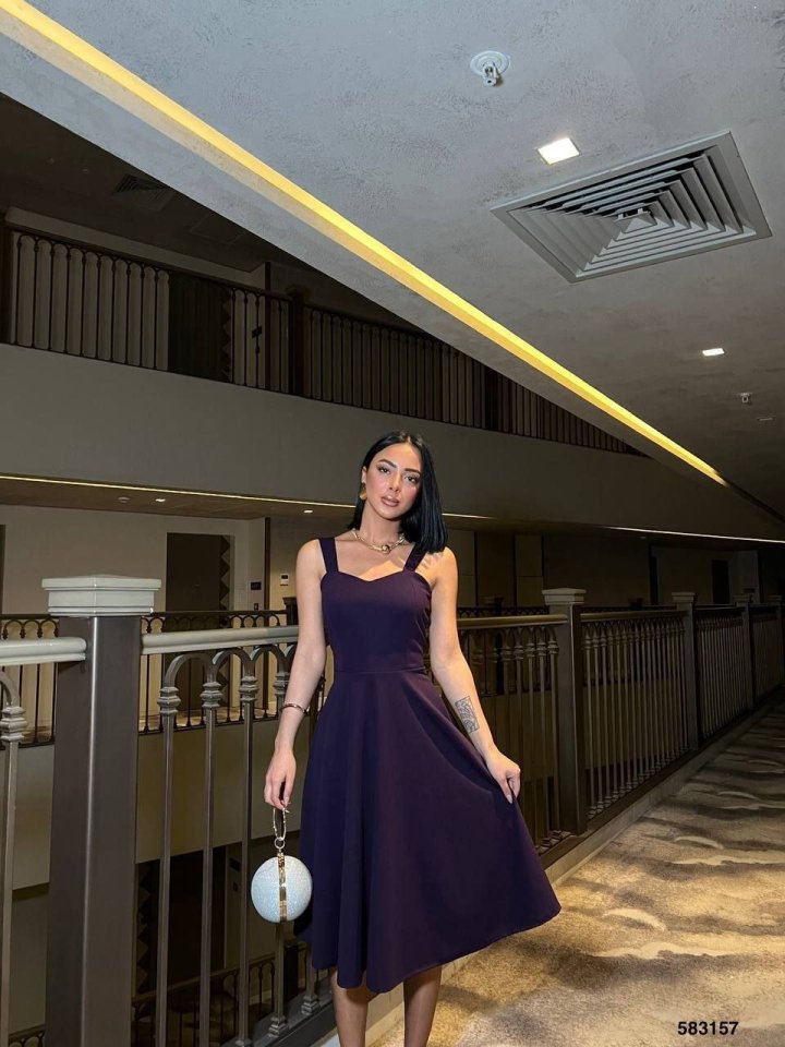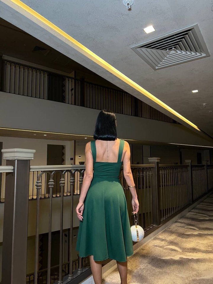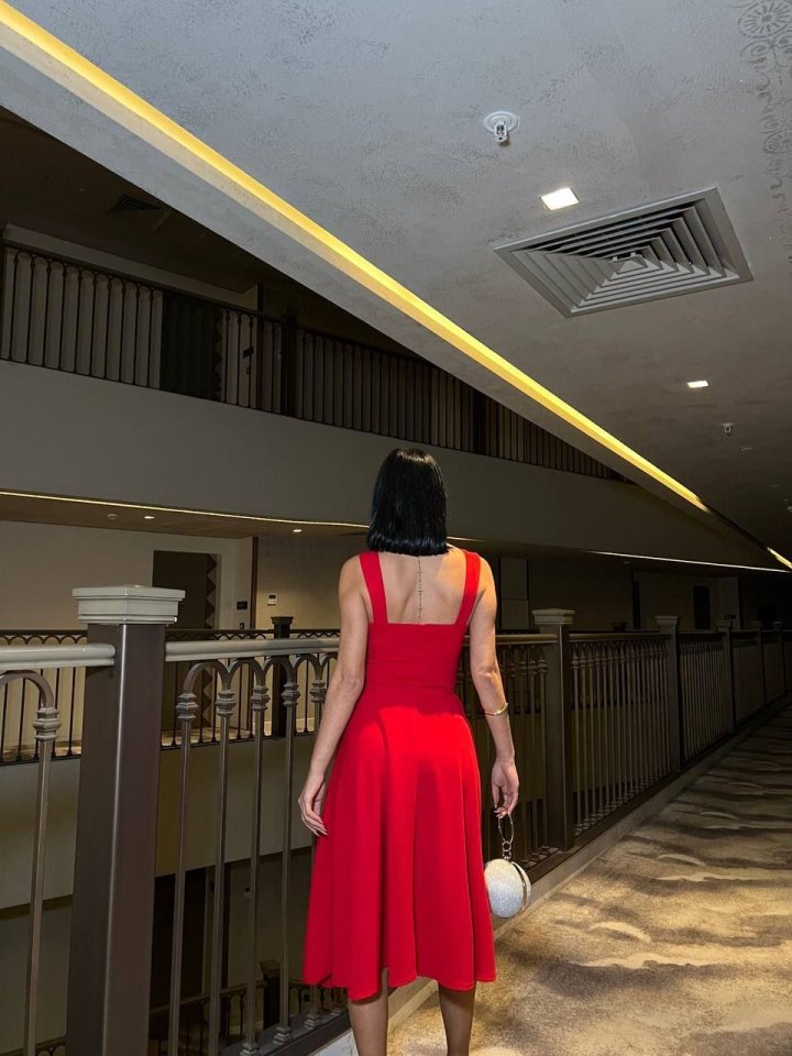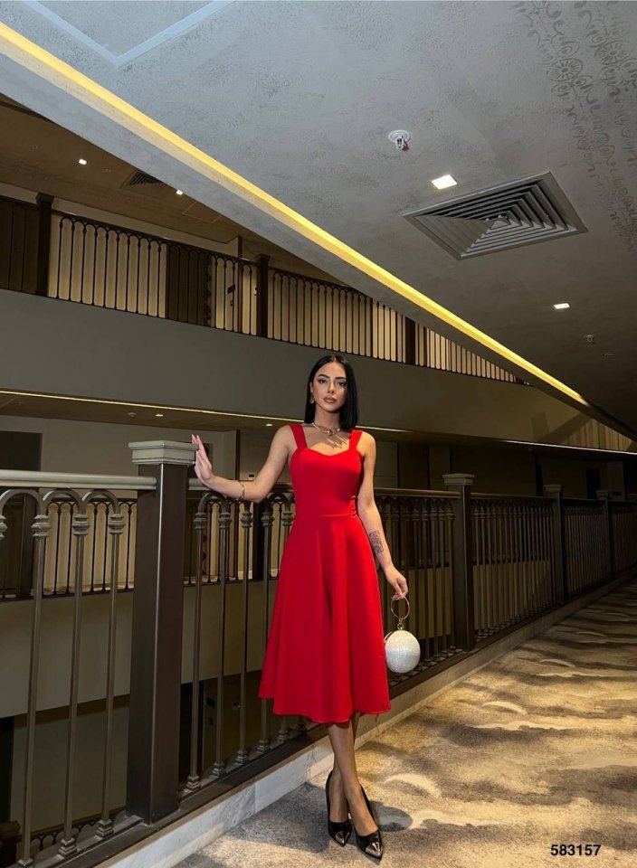 Kadın Dalgıç Krep Kumaş Kalp Yaka Askılı Midi Boy Elbise