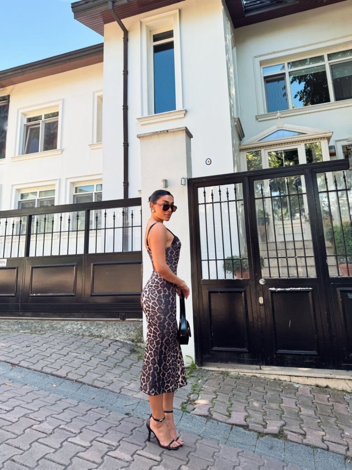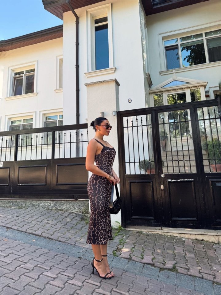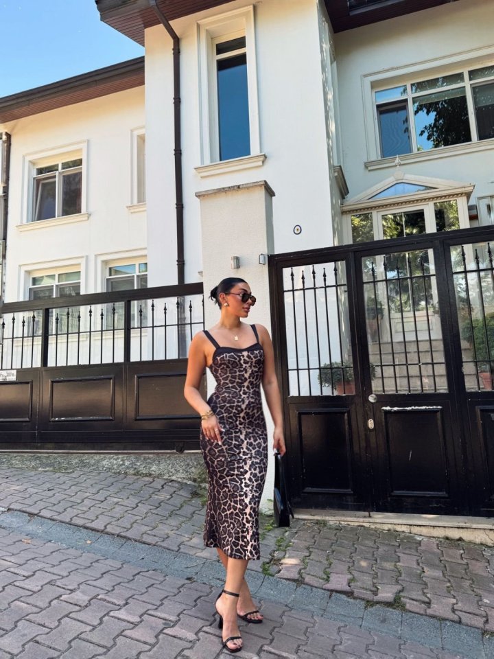 Kadın Dalgıç Kumaş Dijital Leopar Baskılı Midi Boy Elbise