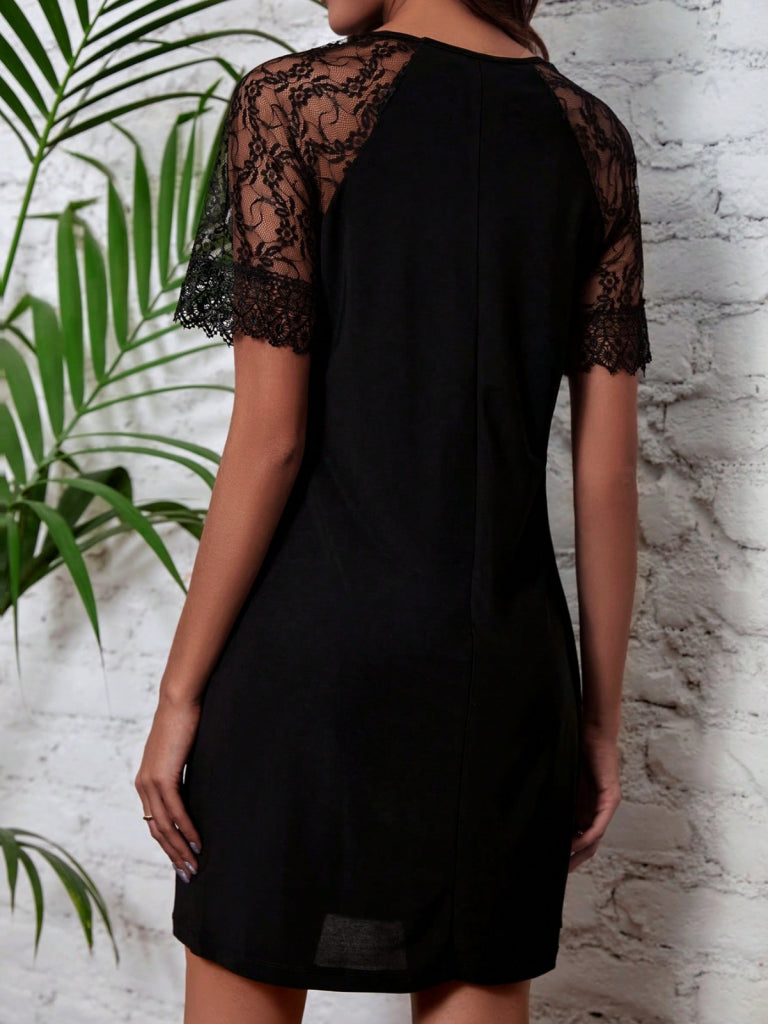 Kadın Dantelli Kısa Kollu Damla Yaka Krep Elbise