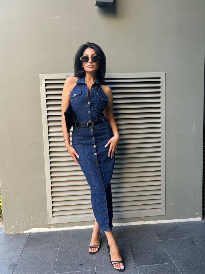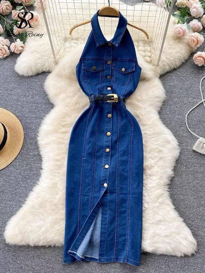 Kadın Düğme Detaylı Belden Kemerli Sırt Dekolte Kot Elbise