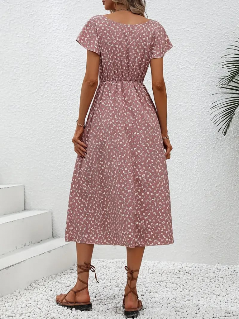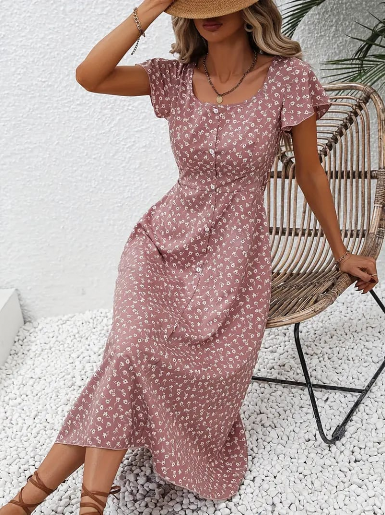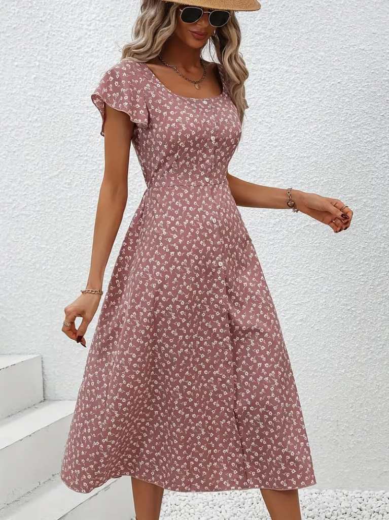 Kadın Düğme Detaylı çiçek Desen Midi Boy Süprem Kloş Elbise