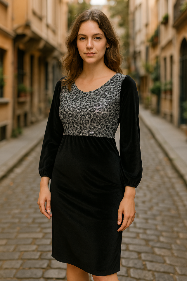 Kadın Fırsat ürünü Leopar Desen Pul Payet Işlemeli Midi Boy Kadife Kumaş Elbise