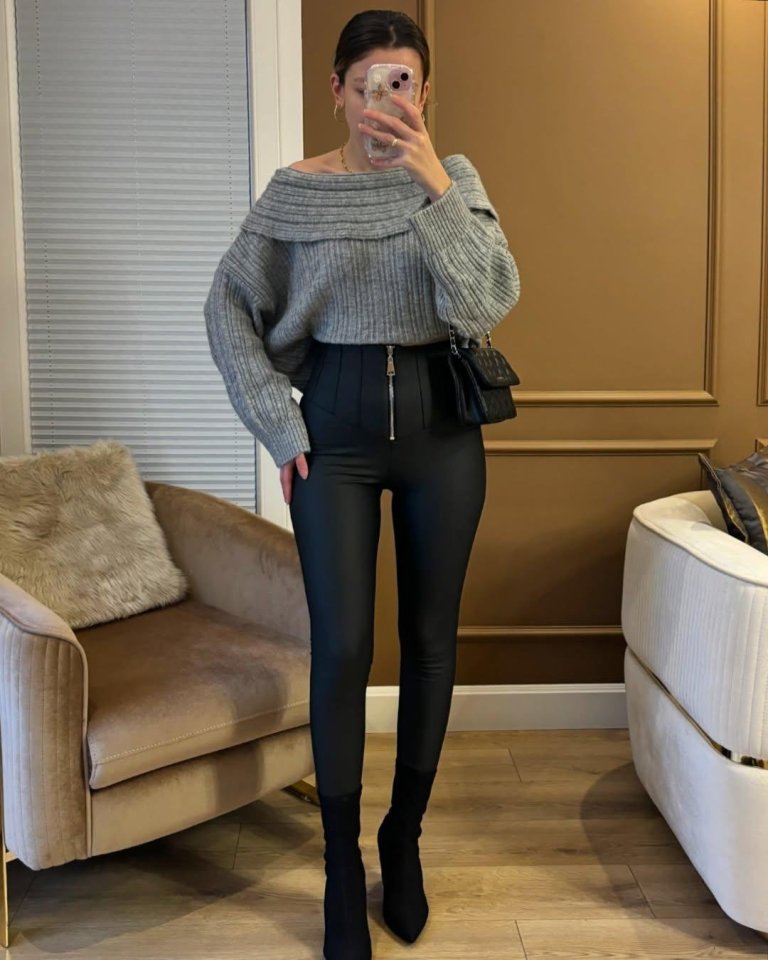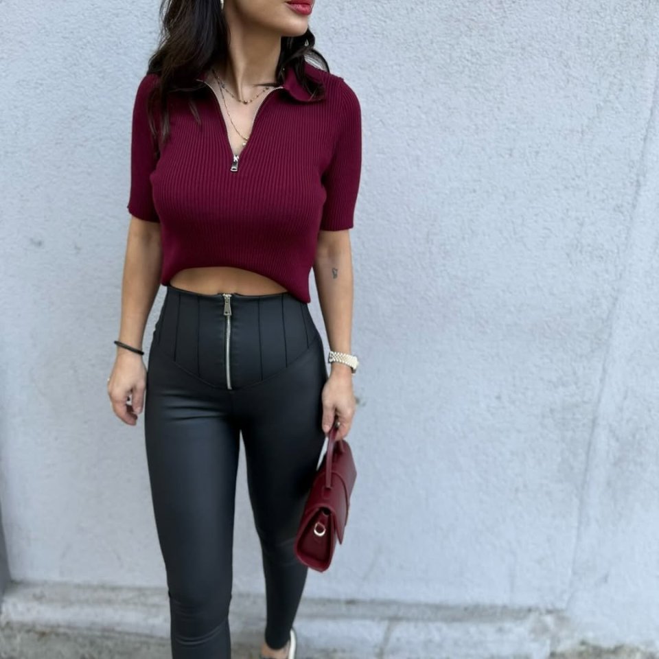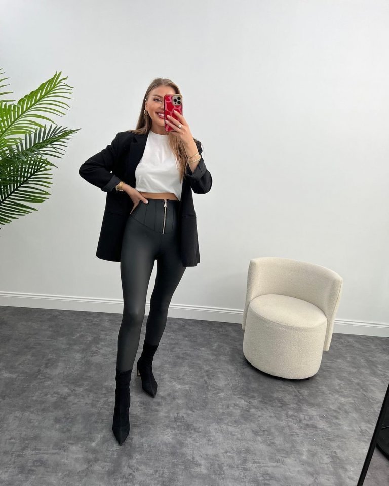Kadın Geniş Fermuarlı Toparlayıcı Yüksek Bel Içi şardonlu Deri Tayt