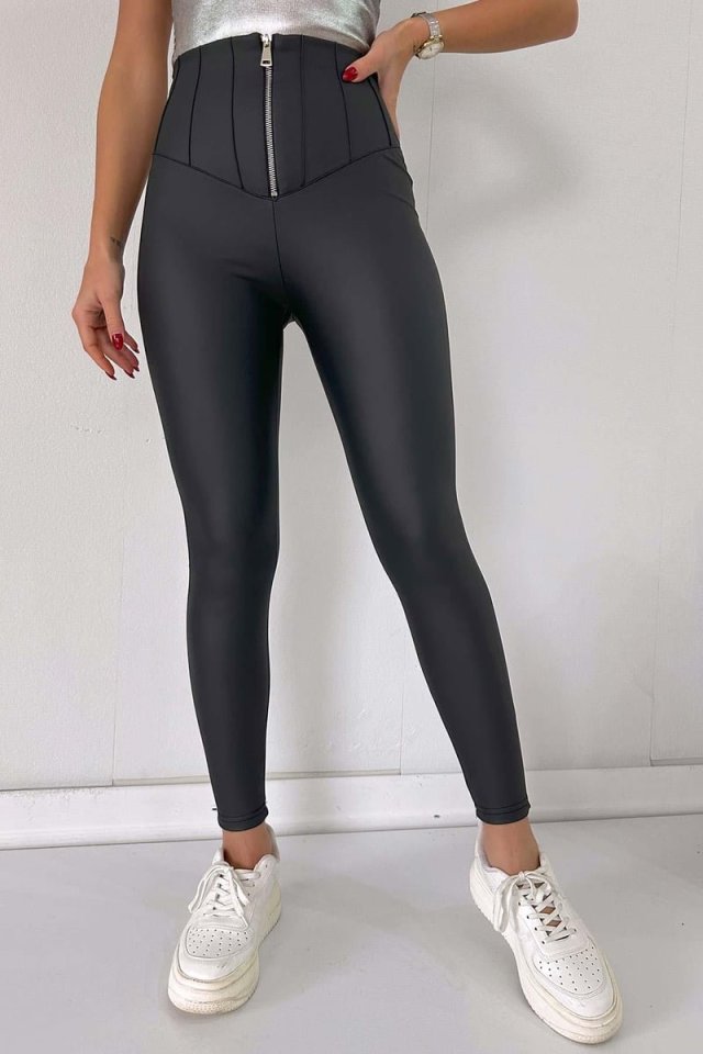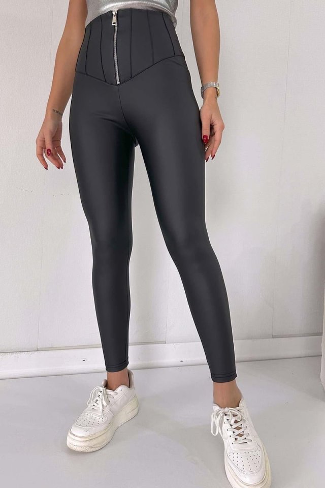 Kadın Geniş Fermuarlı Toparlayıcı Yüksek Bel Içi şardonlu Deri Tayt
