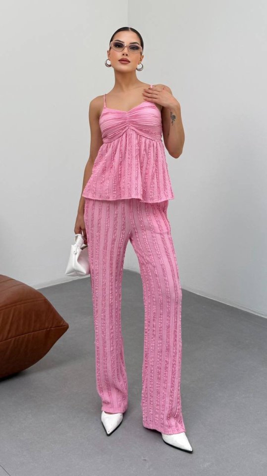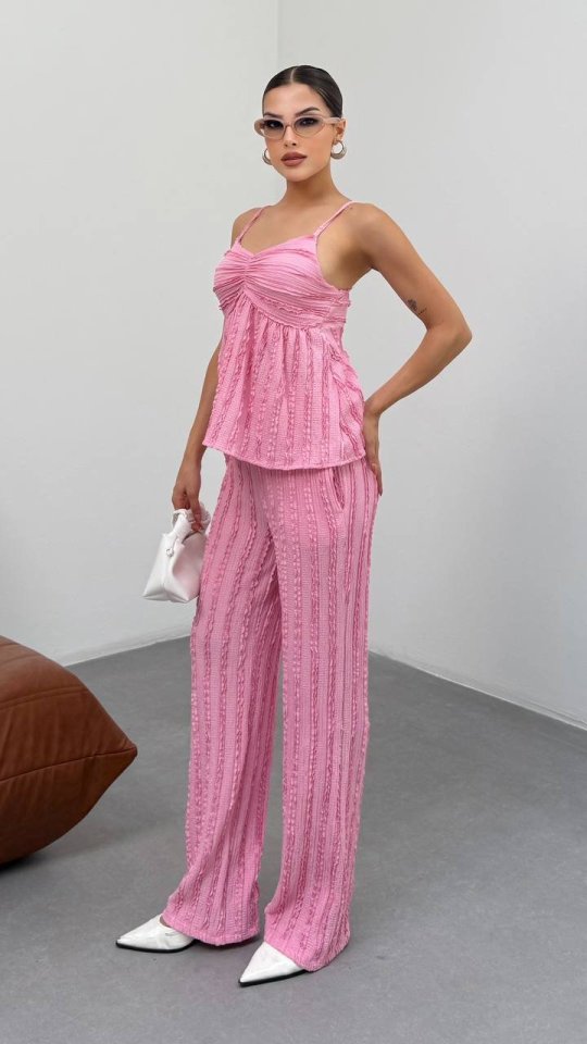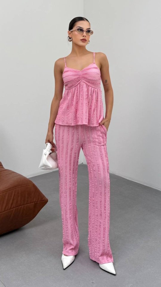 Kadın Haki Dokulu Askılı Üst Ve Bol Paça Pantolon 2’li Takım