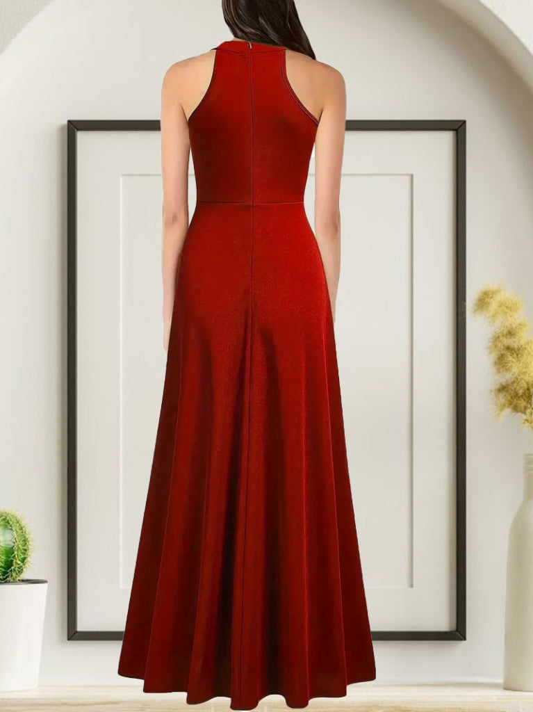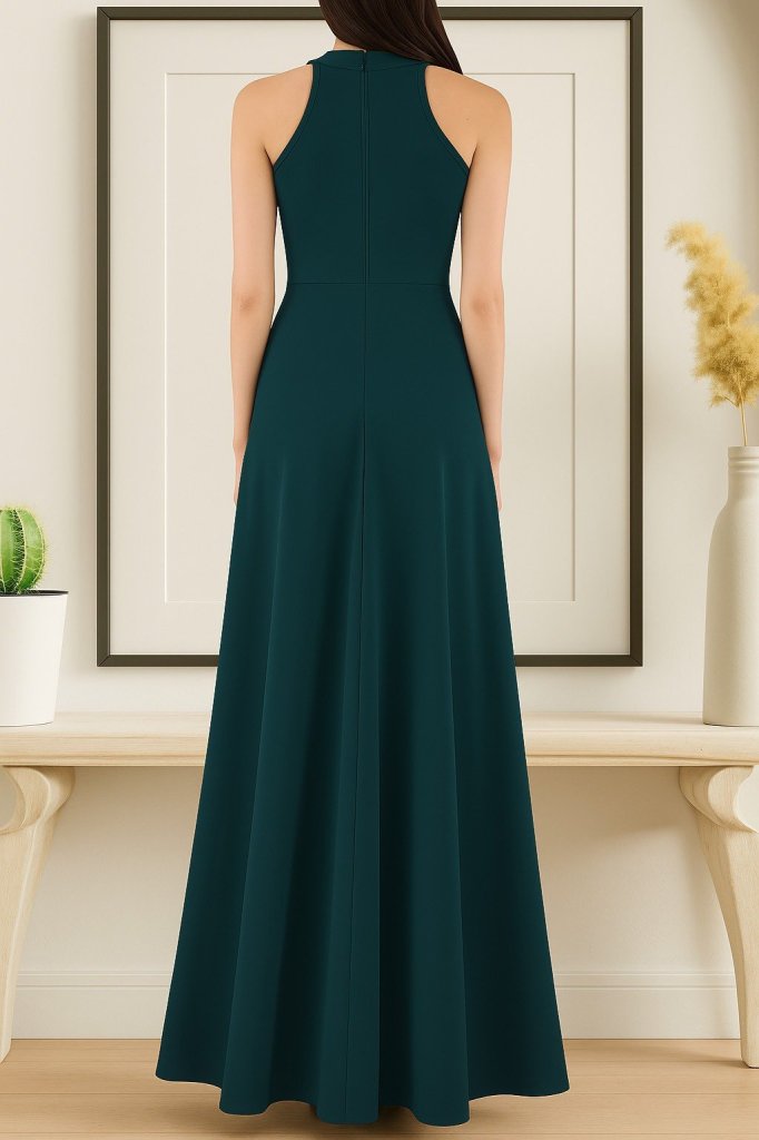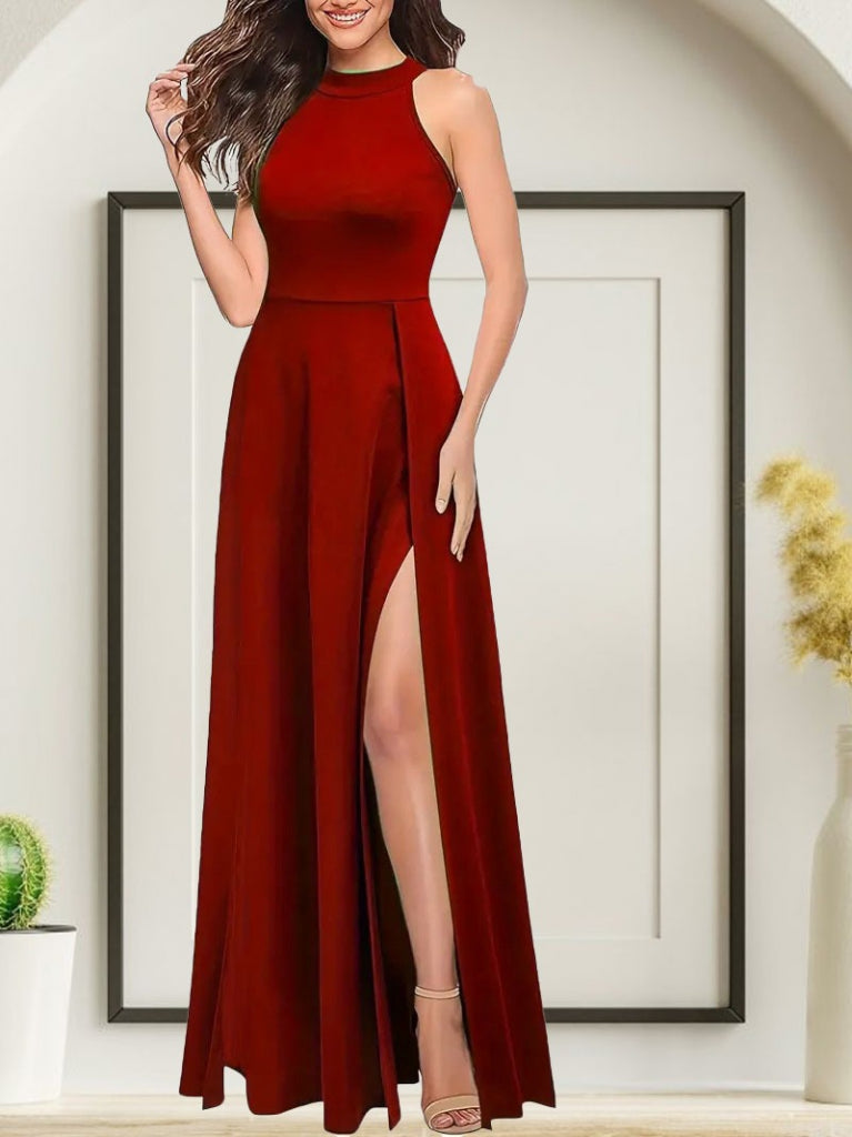 Kadın Halter Yaka Derin Yırtmaç Detaylı Tam Boy Ithal Krep Abiye Elbise