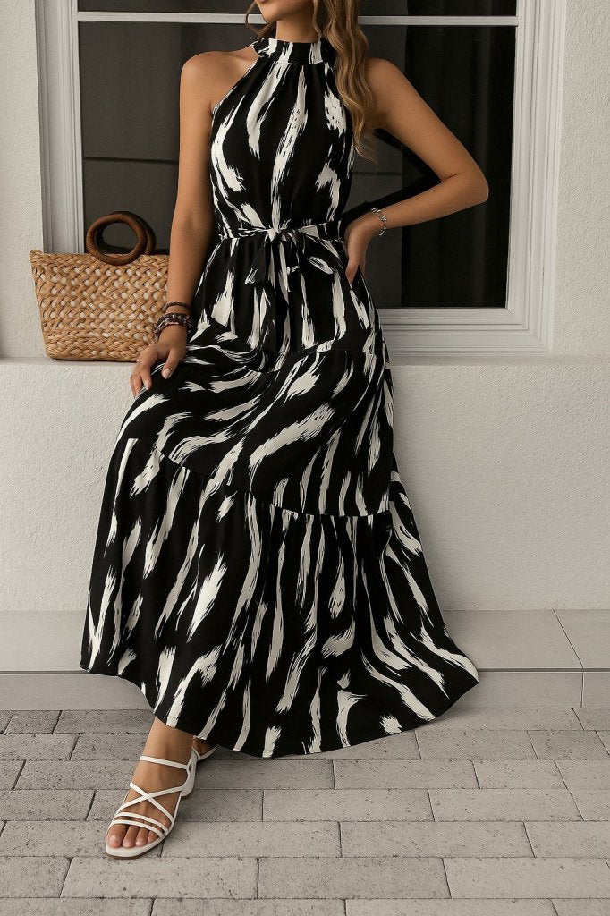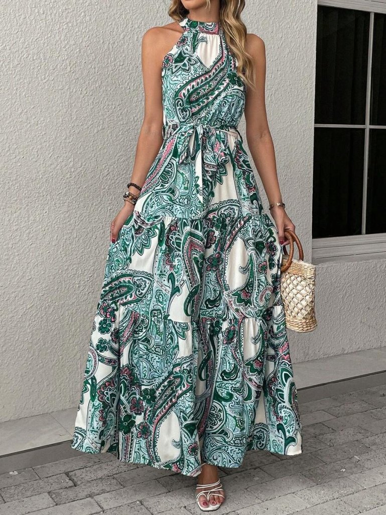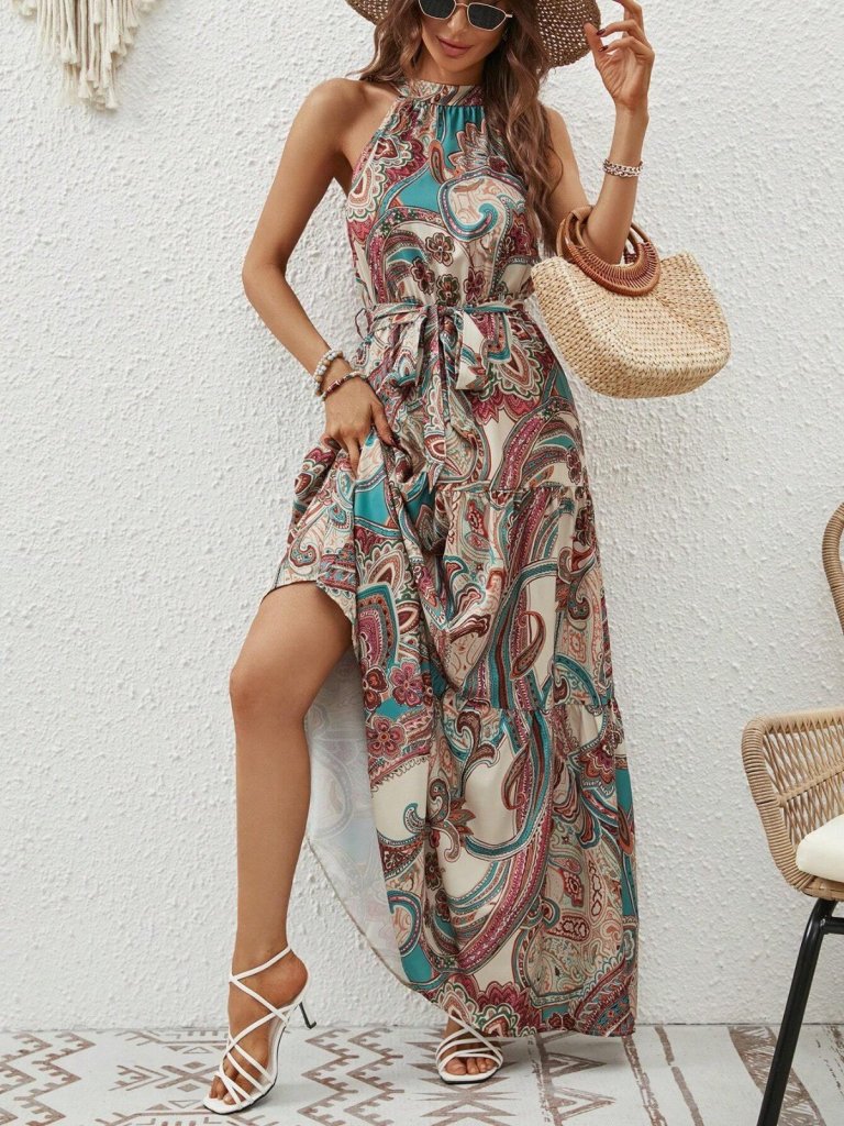 Kadın Halter Yakalı Omuzlardan Açık Kuşaklı Maksi Boy Desenli Süprem Elbise