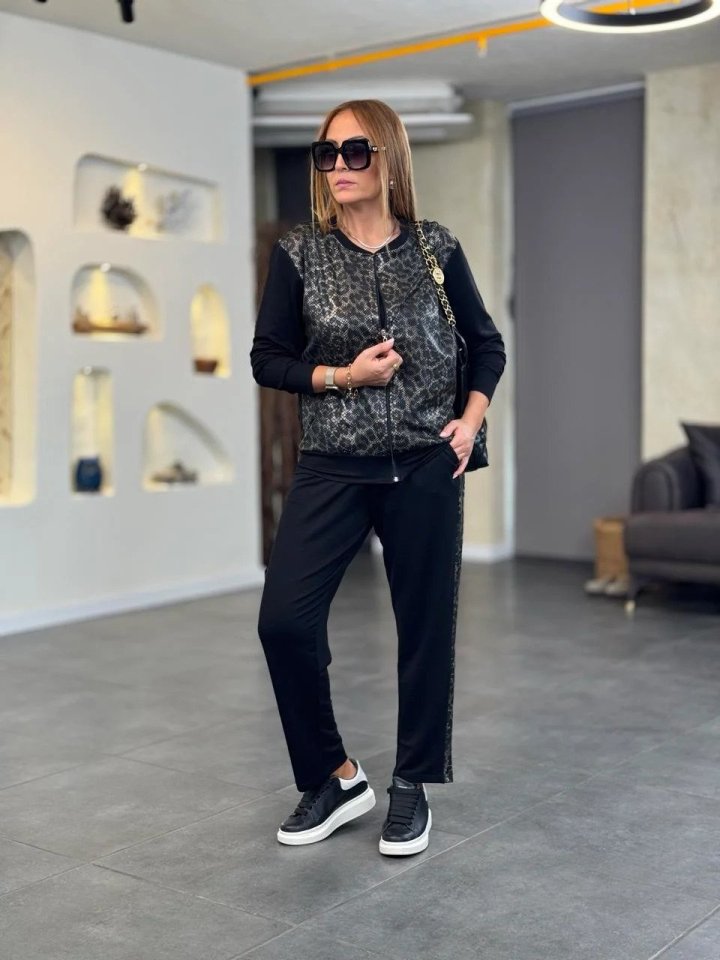 Kadın İki İplik Kumaş Yılan Desenli Fermuarlı İkili Takım