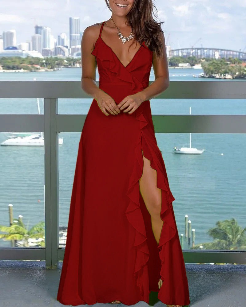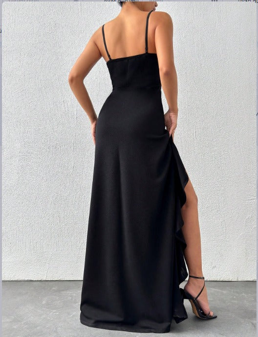 Kadın Ip Askılı Dekolteli Yırtmaç Detay Krep Elbise