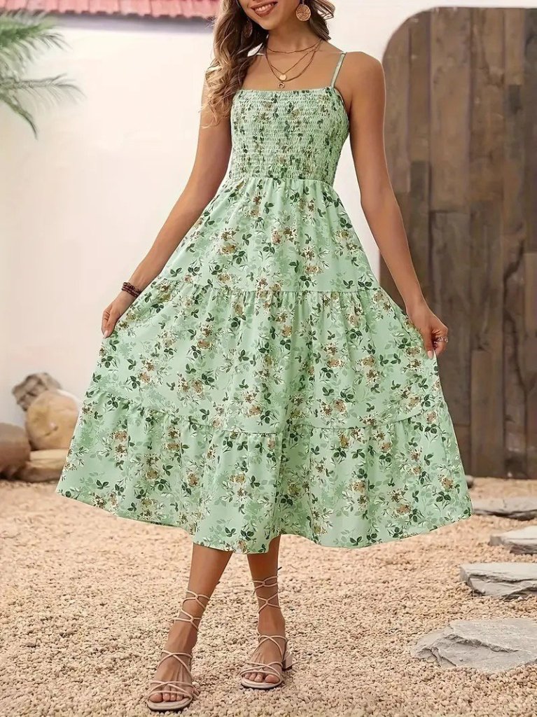 Kadın Ip Askılı Geniş V Yakalı Desenli Uzun Süprem Elbise