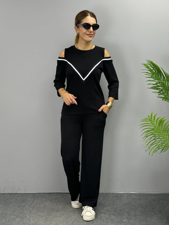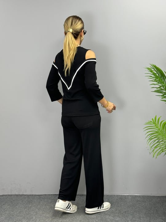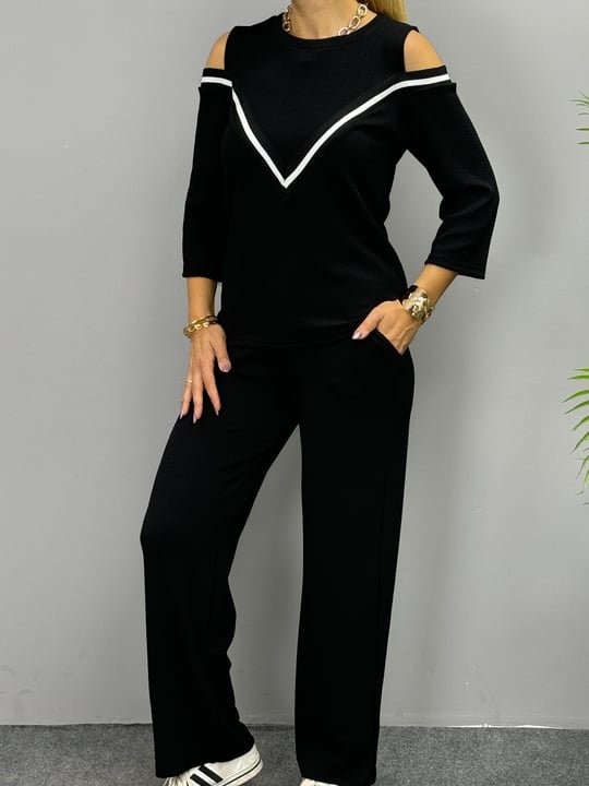 Kadın Ithal Burgu Kumaş Uzun Kollu Omuz Dekolteli Bluz Ve Pantolon Ikili Takım