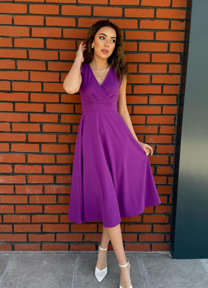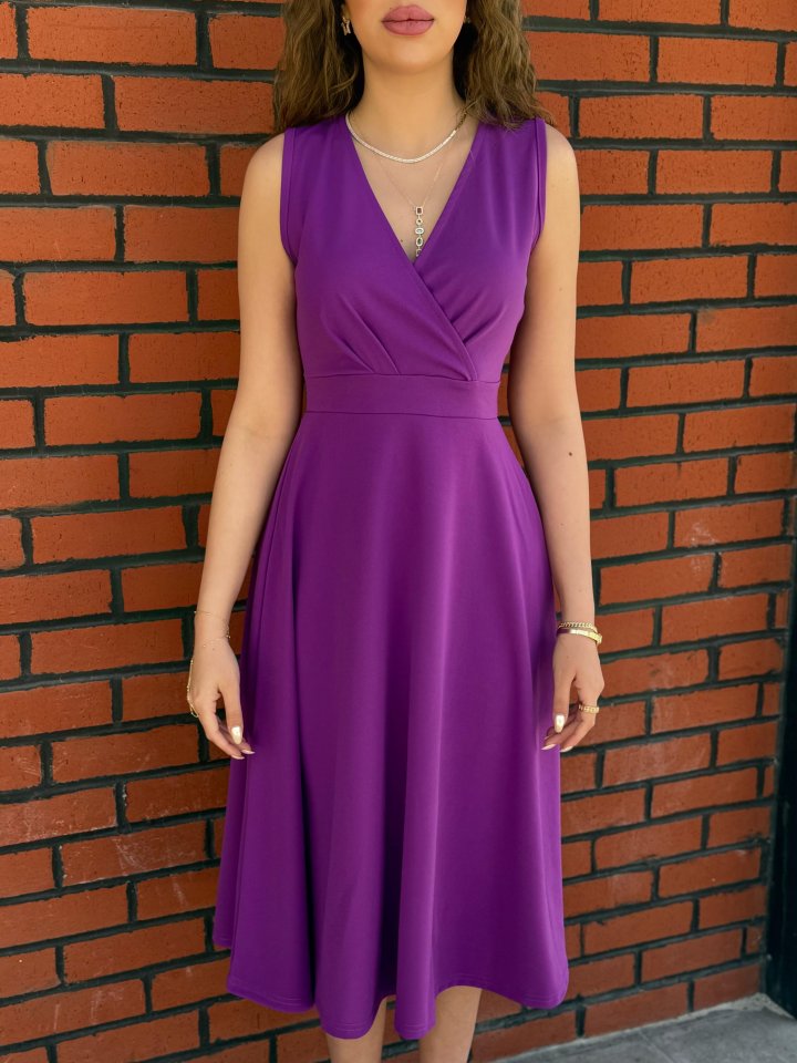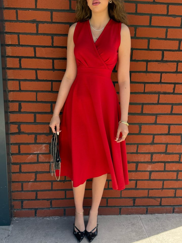 Kadın Ithal Krep Kumaş Kruvaze Yaka Eteği Kloş Kolsuz Mini Elbise